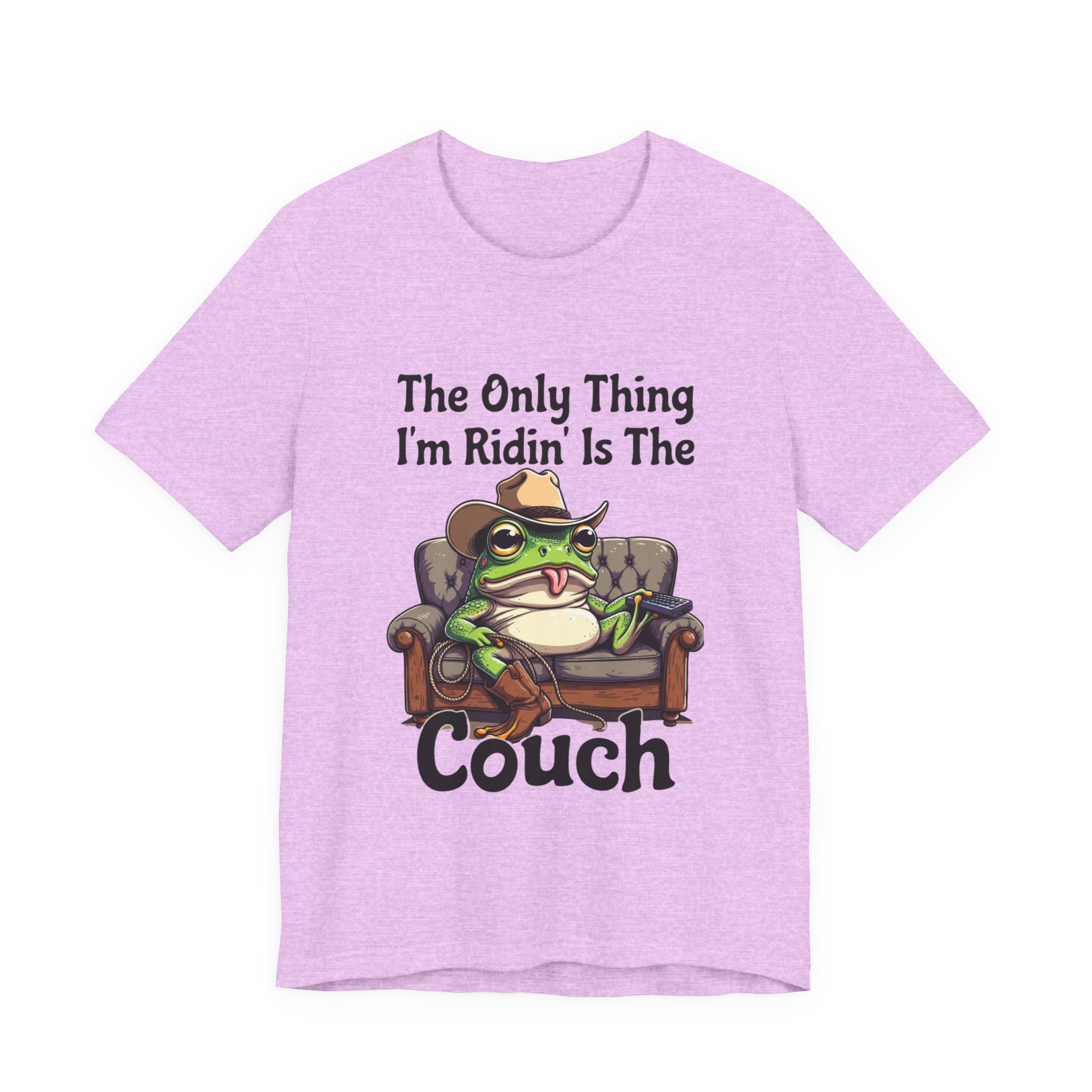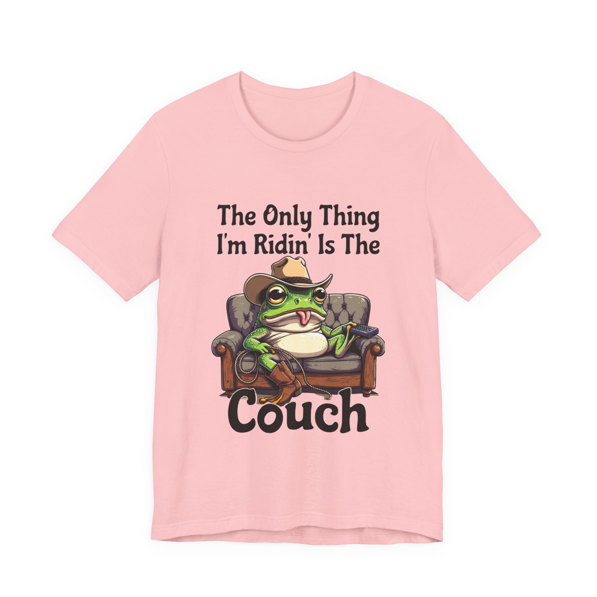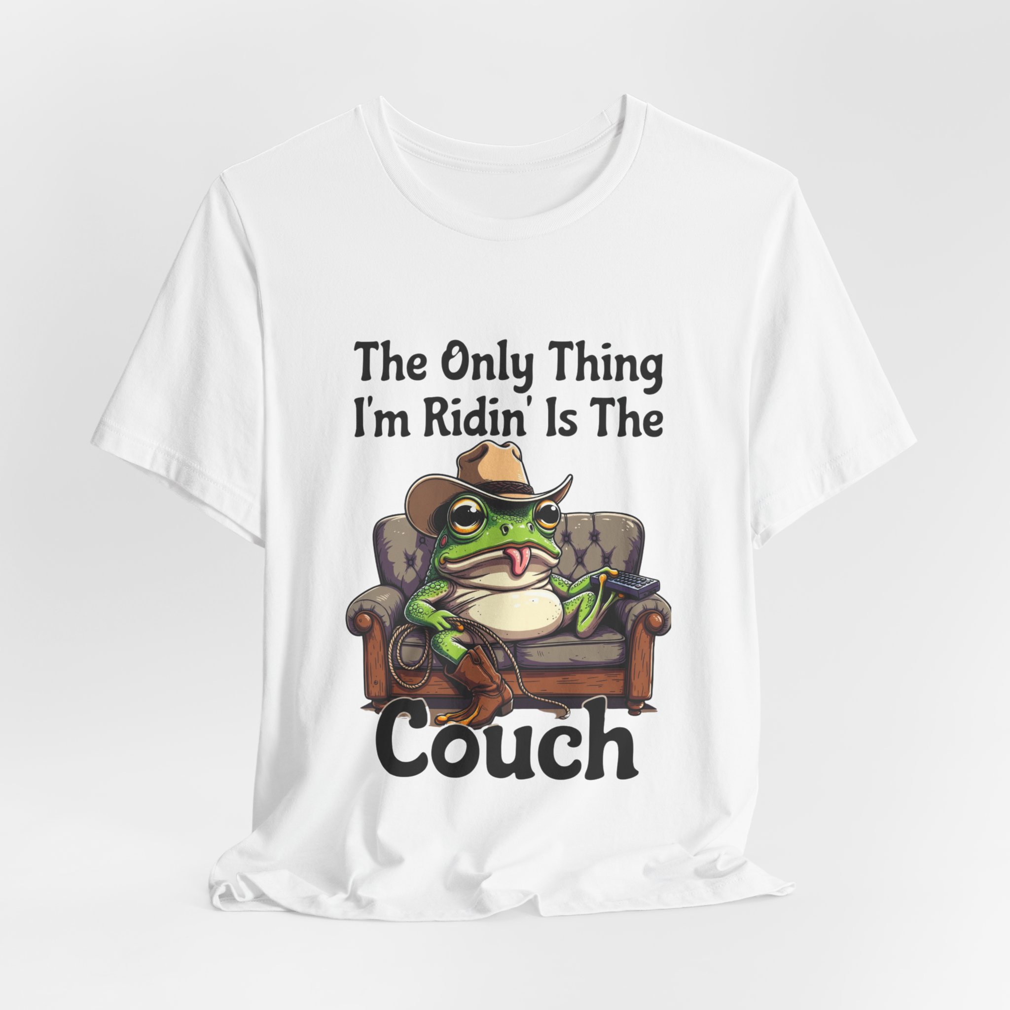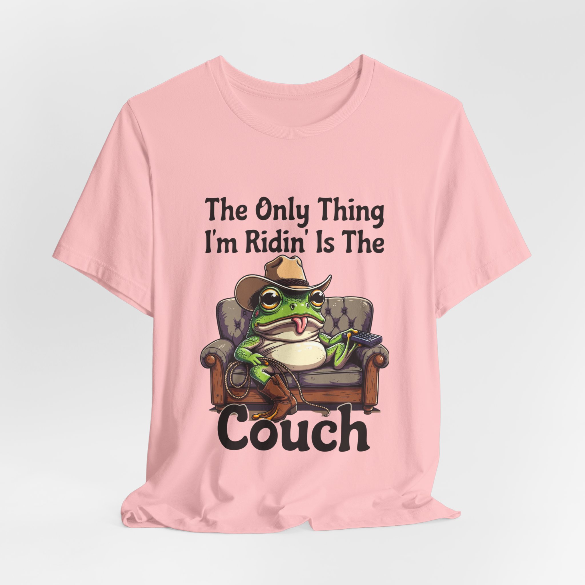 Slip into something that speaks lazy-day honesty. This lightweight tee features a cheeky frog lounging on a well-worn couch with the phrase “The Only Thing I’m Ridin’ Is The Couch.” The design’s playful attitude—smug, silly, and effortlessly laid-back—shows loud and clear from across the room thanks to crisp, vibrant printing.