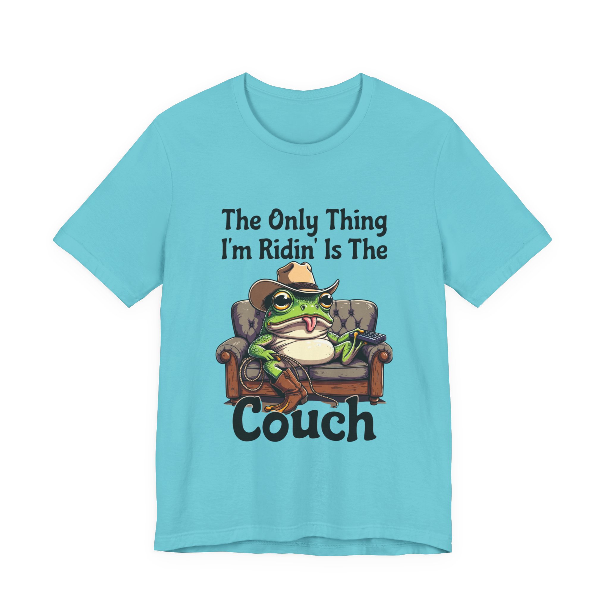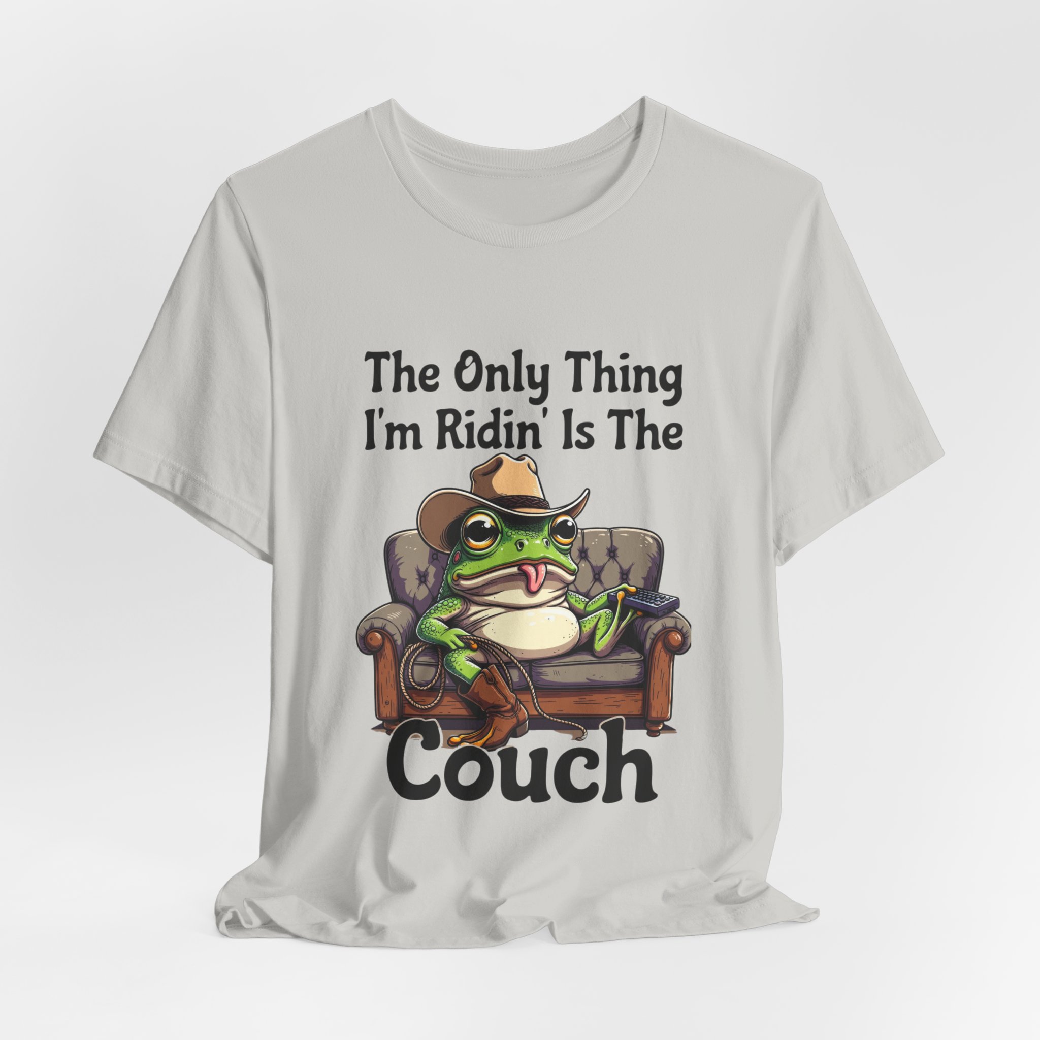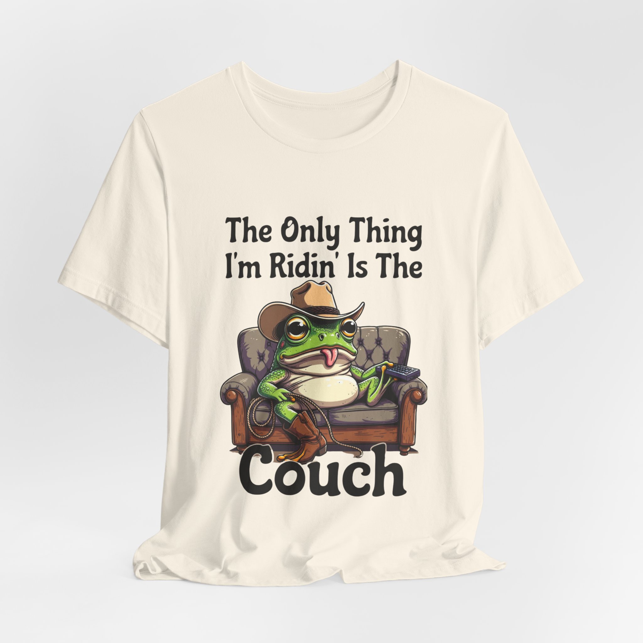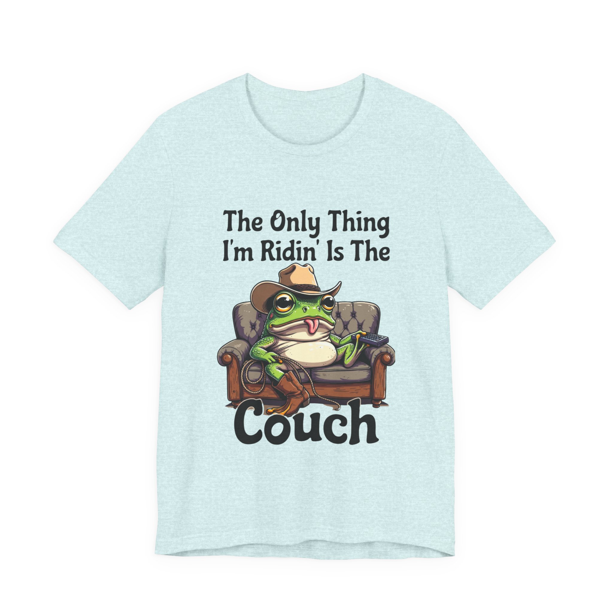Slip into something that speaks lazy-day honesty. This lightweight tee features a cheeky frog lounging on a well-worn couch with the phrase “The Only Thing I’m Ridin’ Is The Couch.” The design’s playful attitude—smug, silly, and effortlessly laid-back—shows loud and clear from across the room thanks to crisp, vibrant printing.