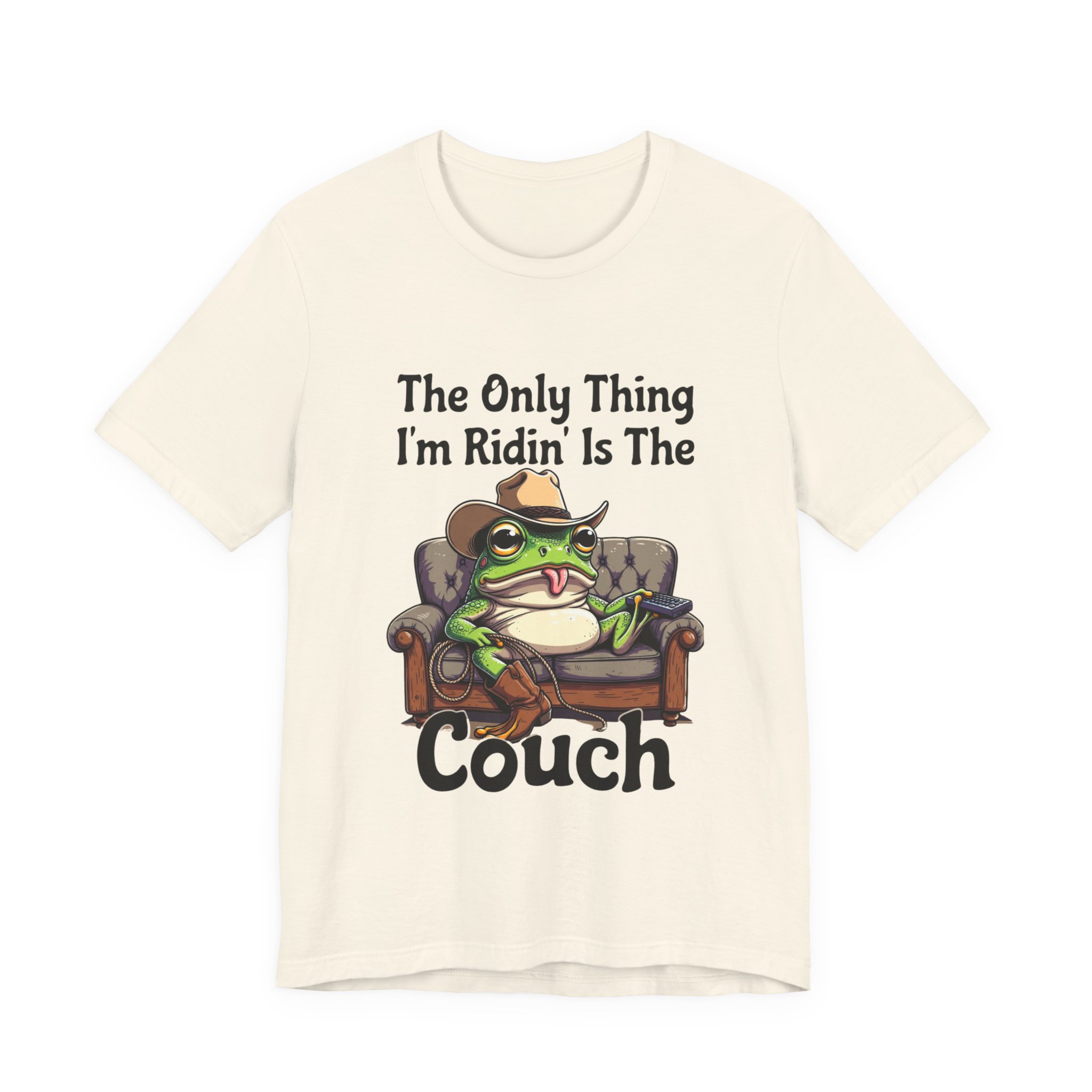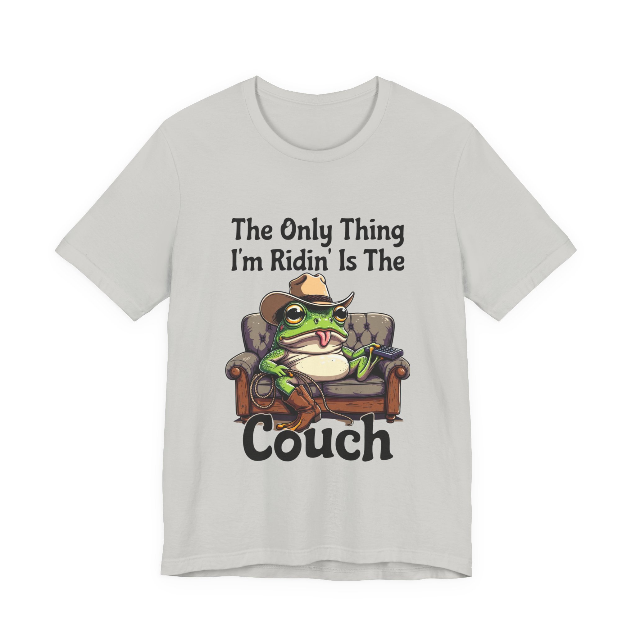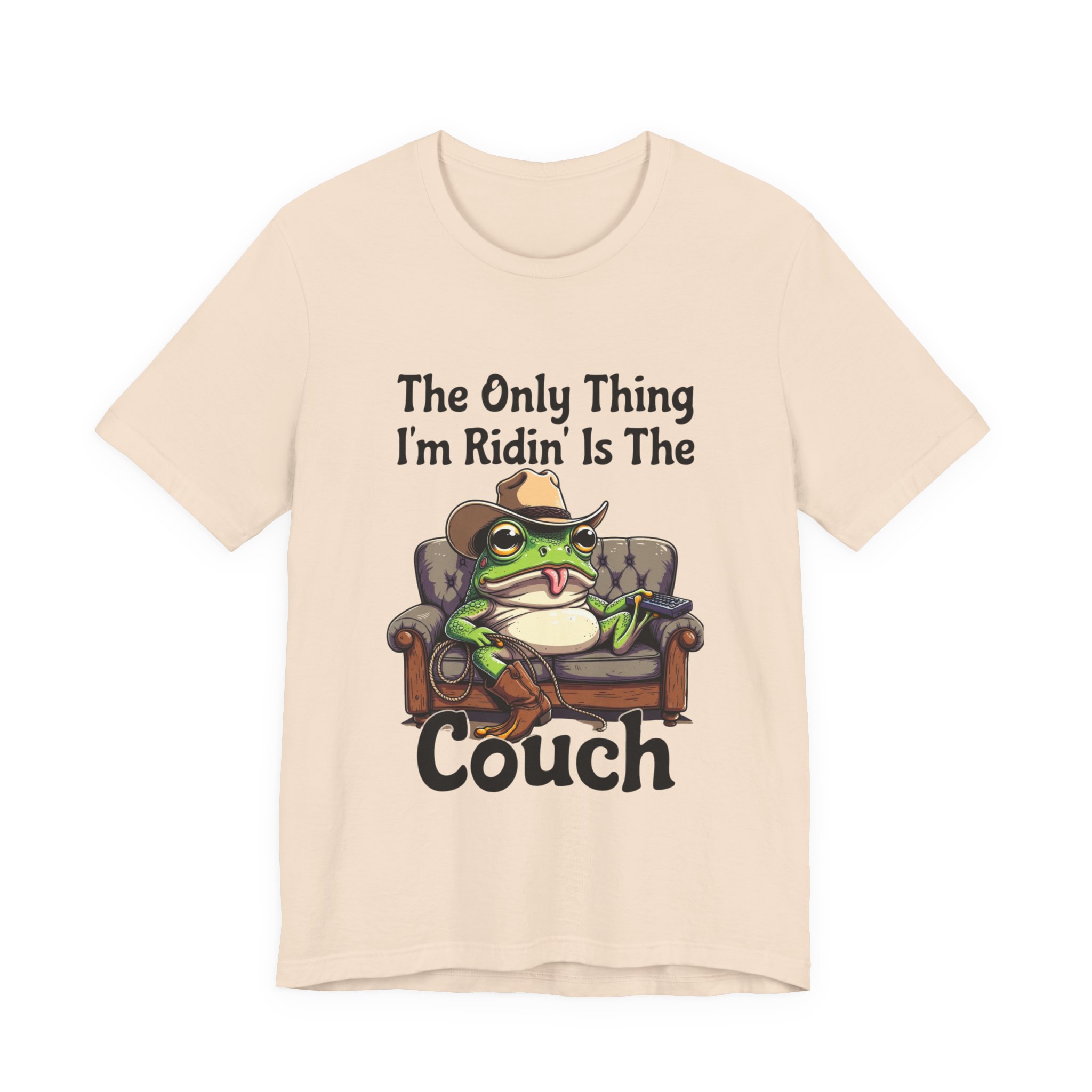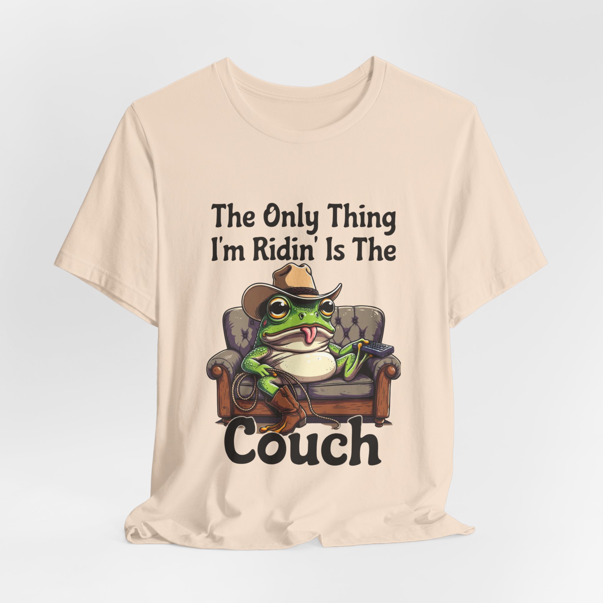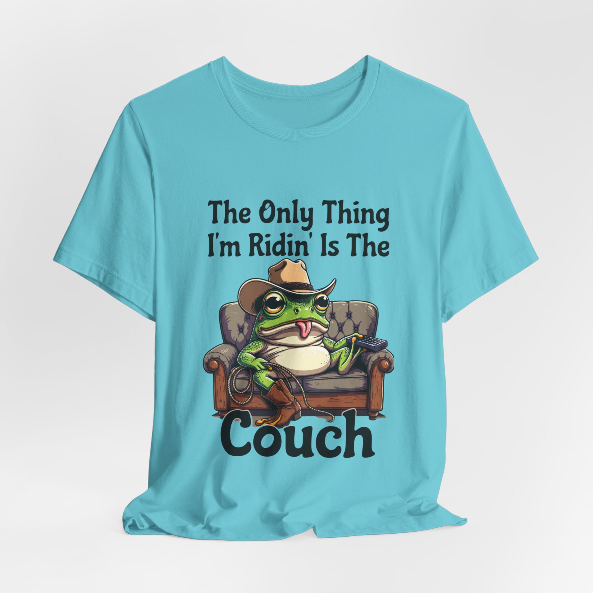 Slip into something that speaks lazy-day honesty. This lightweight tee features a cheeky frog lounging on a well-worn couch with the phrase “The Only Thing I’m Ridin’ Is The Couch.” The design’s playful attitude—smug, silly, and effortlessly laid-back—shows loud and clear from across the room thanks to crisp, vibrant printing.