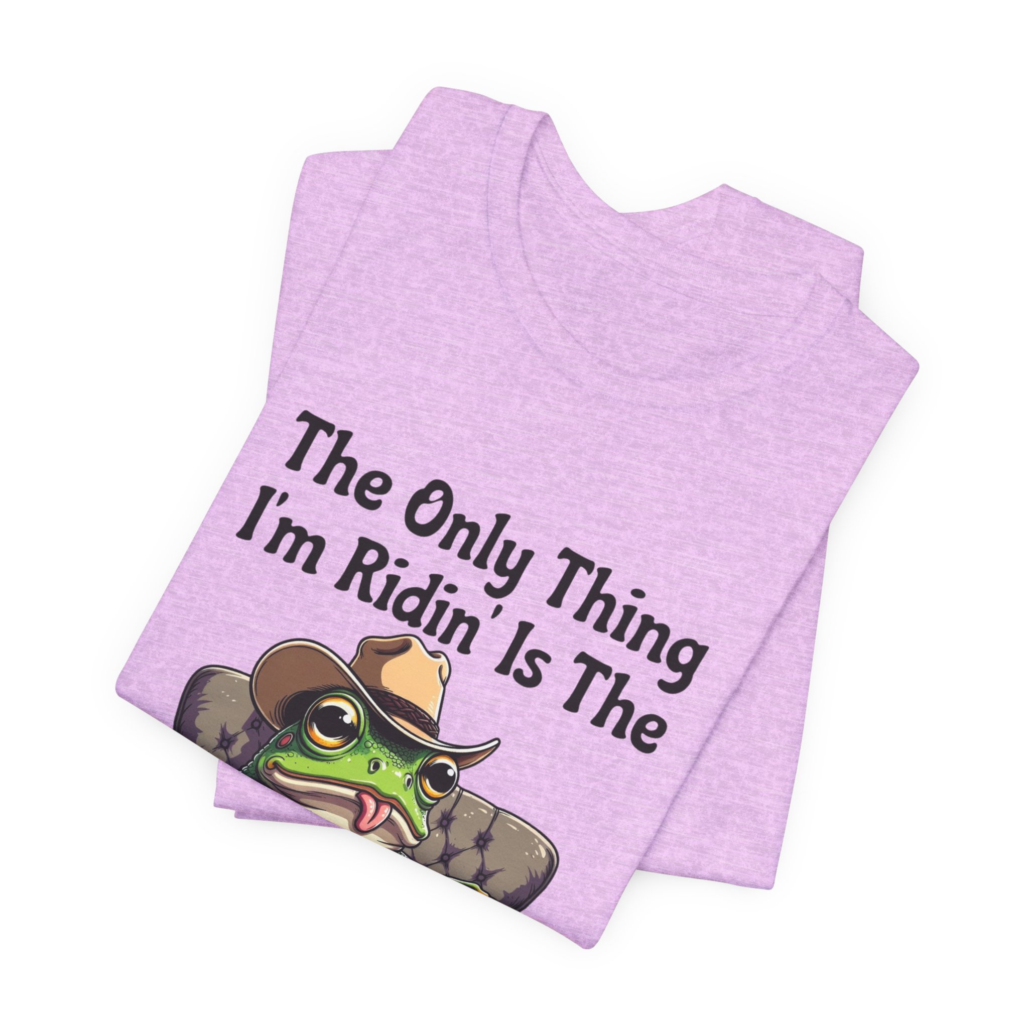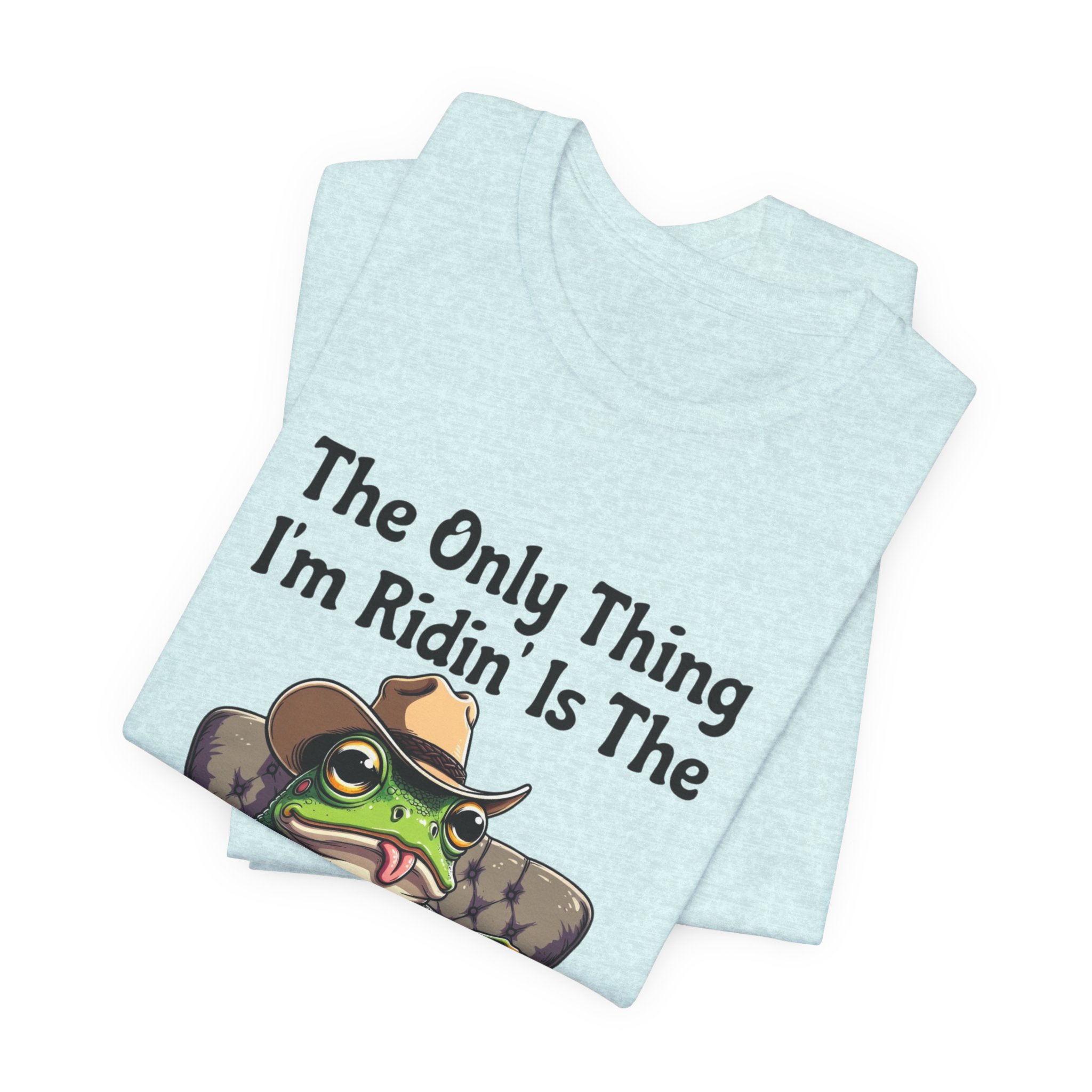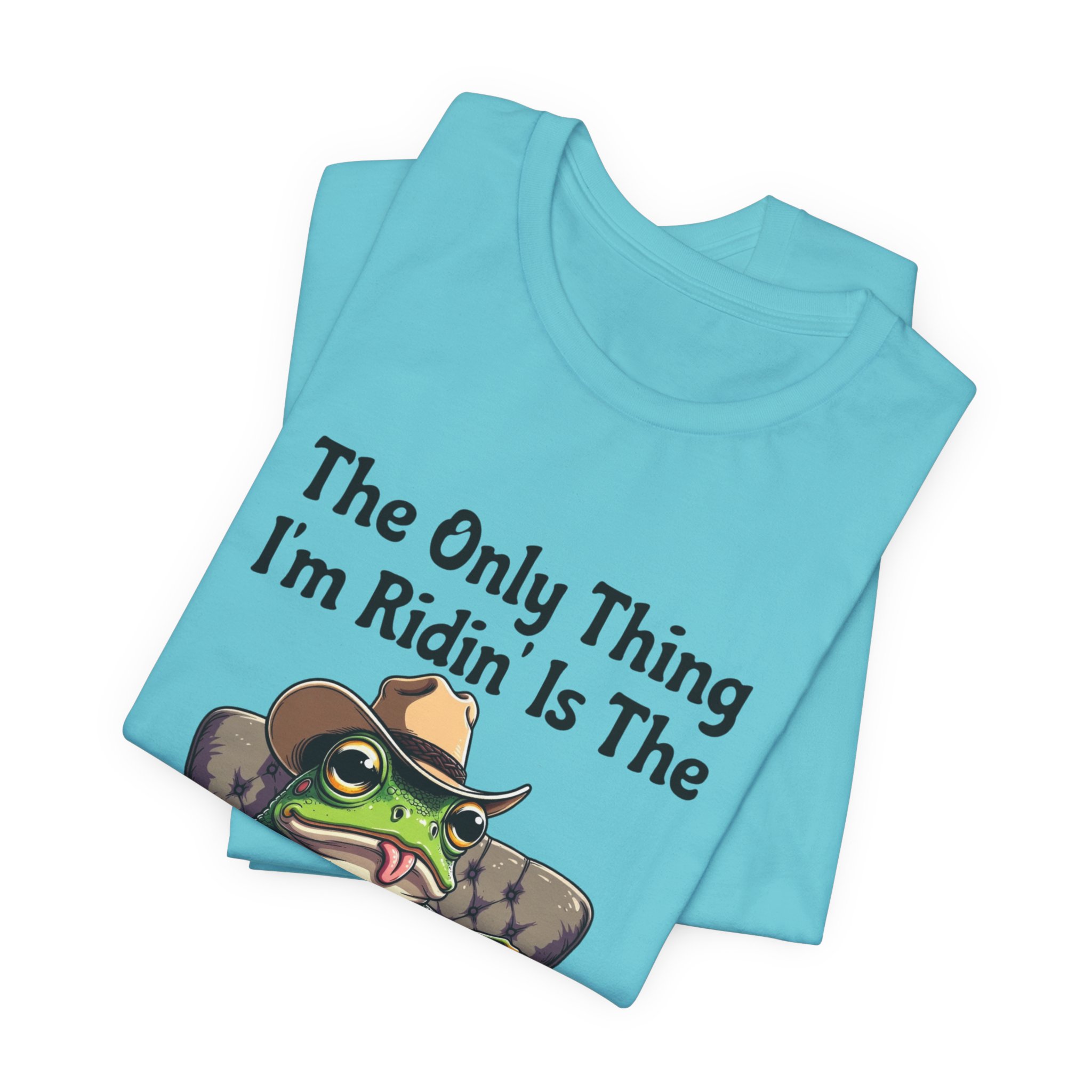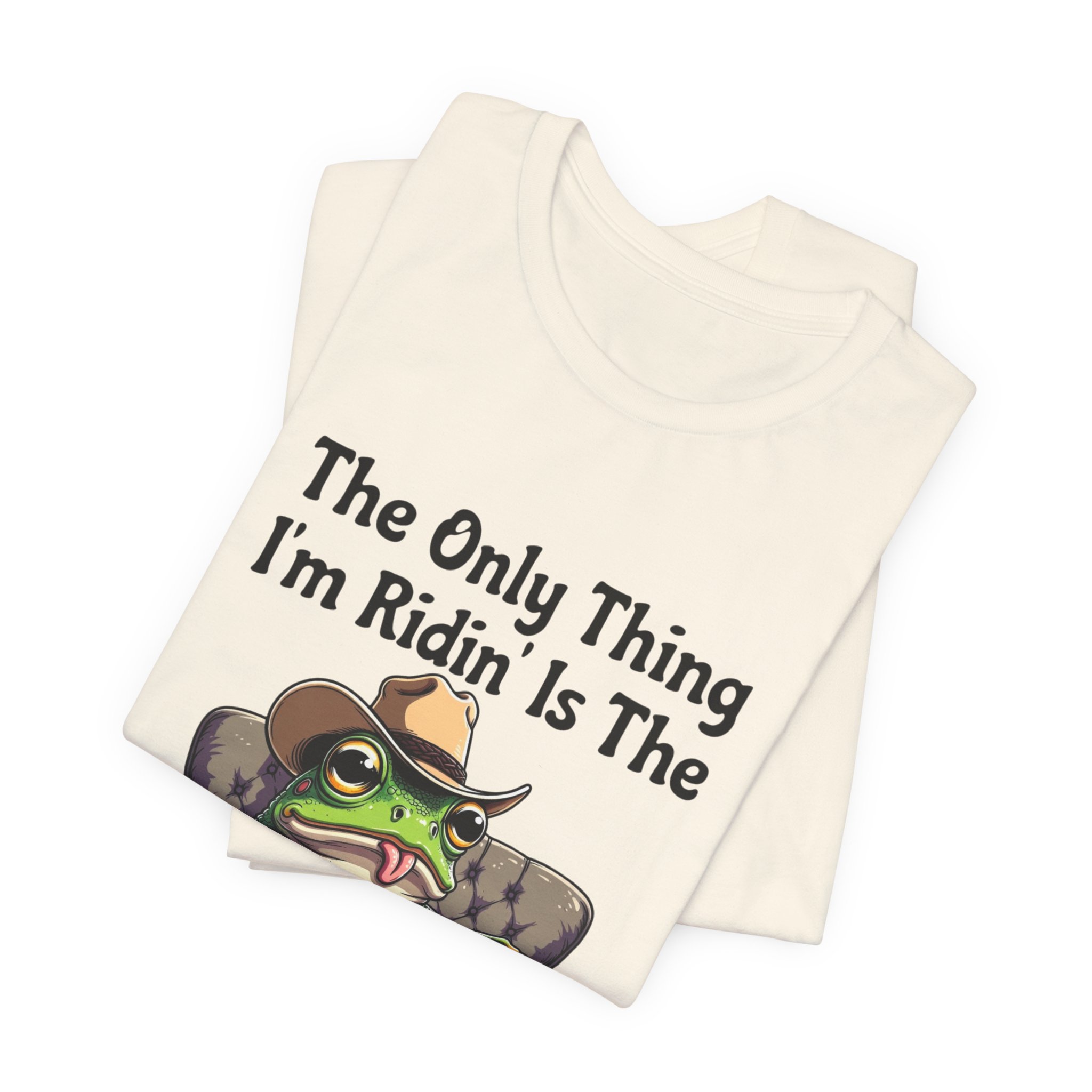 Slip into something that speaks lazy-day honesty. This lightweight tee features a cheeky frog lounging on a well-worn couch with the phrase “The Only Thing I’m Ridin’ Is The Couch.” The design’s playful attitude—smug, silly, and effortlessly laid-back—shows loud and clear from across the room thanks to crisp, vibrant printing.