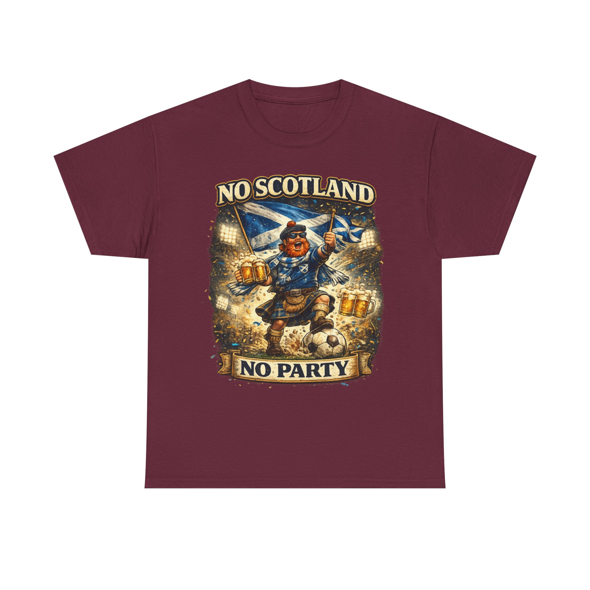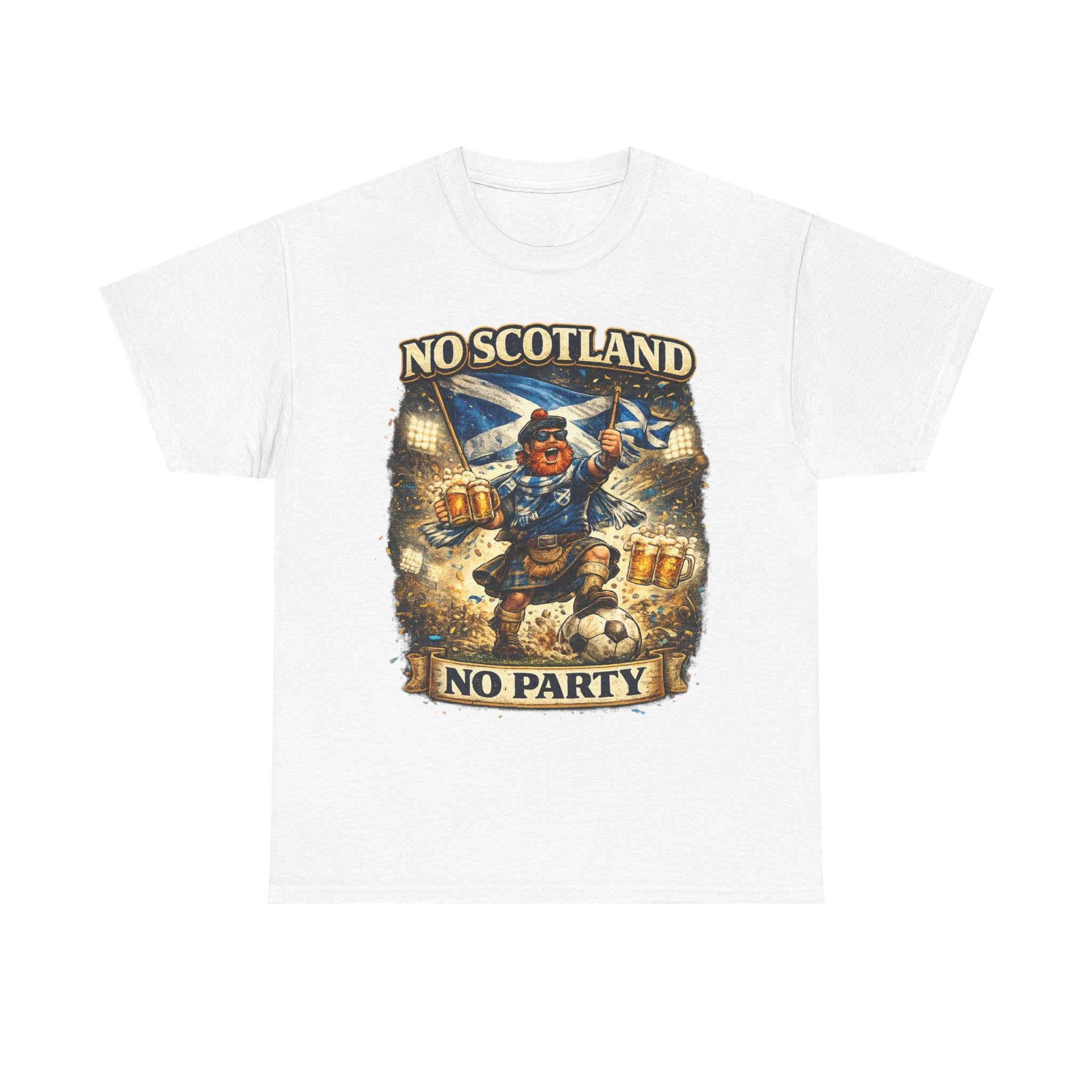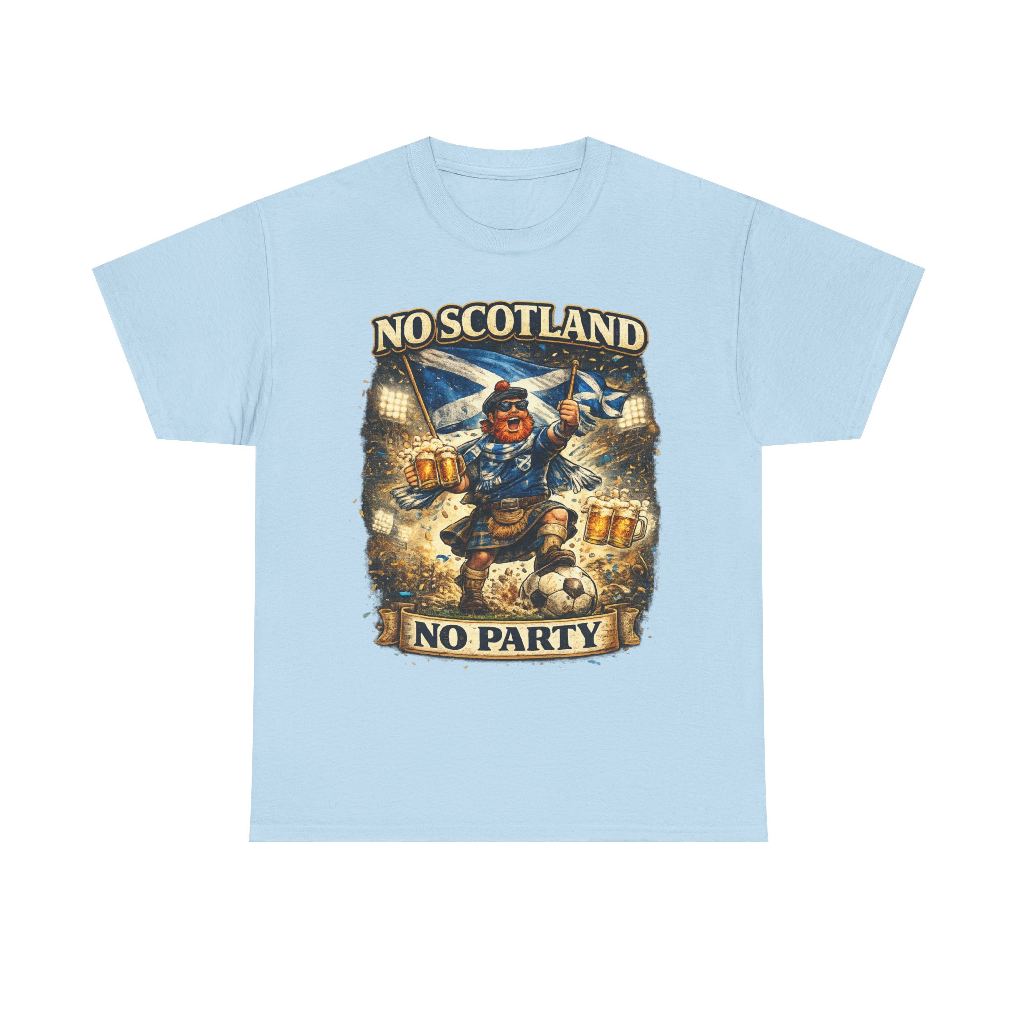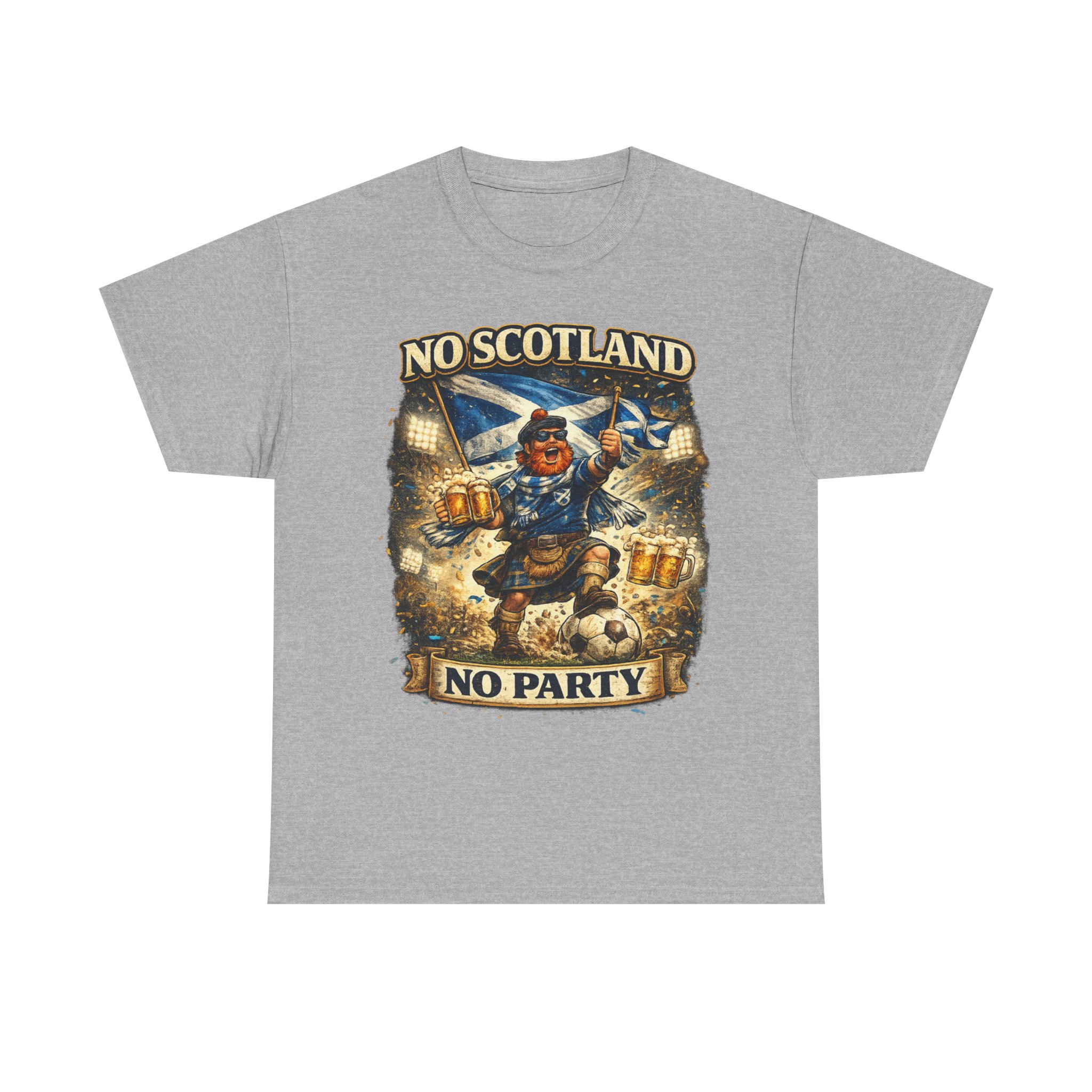 Bring the noise and the laughs with this No Scotland No Party football fan shirt, inspired by one of the most iconic chants from the Tartan Army. Featuring a bold, humorous supporter illustration with a kilted Scottish fan, beer mugs, and football energy, this shirt is perfect for showing your pride for Scotland wherever you watch the match.