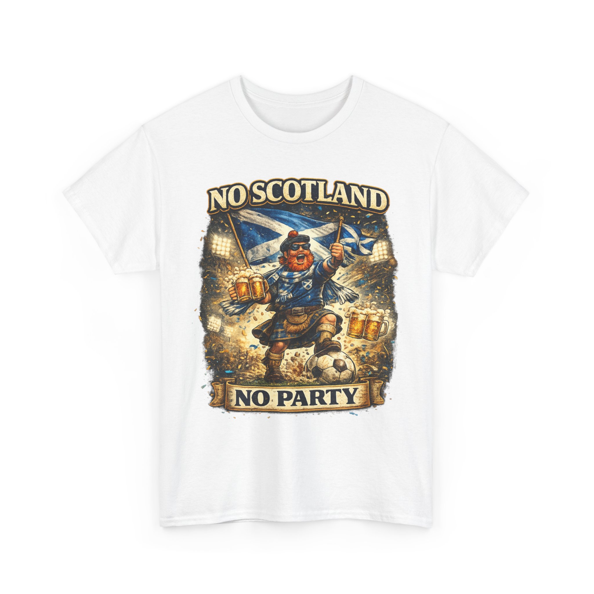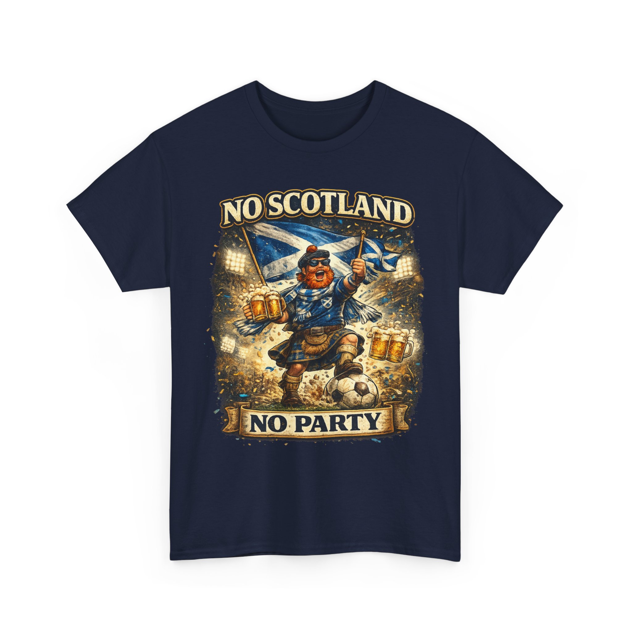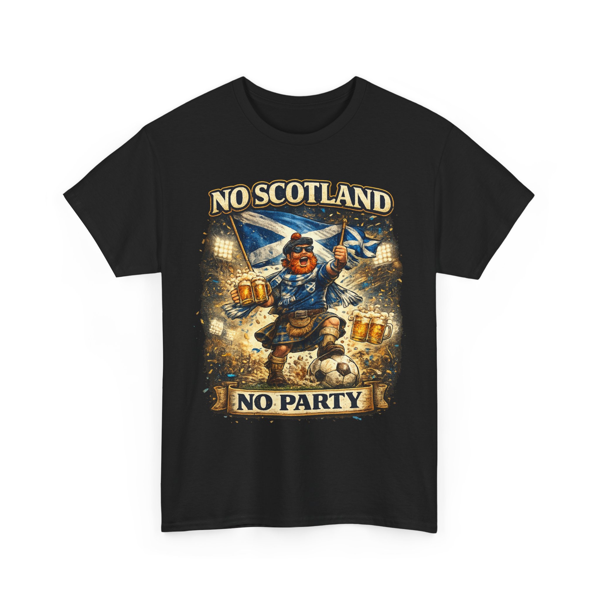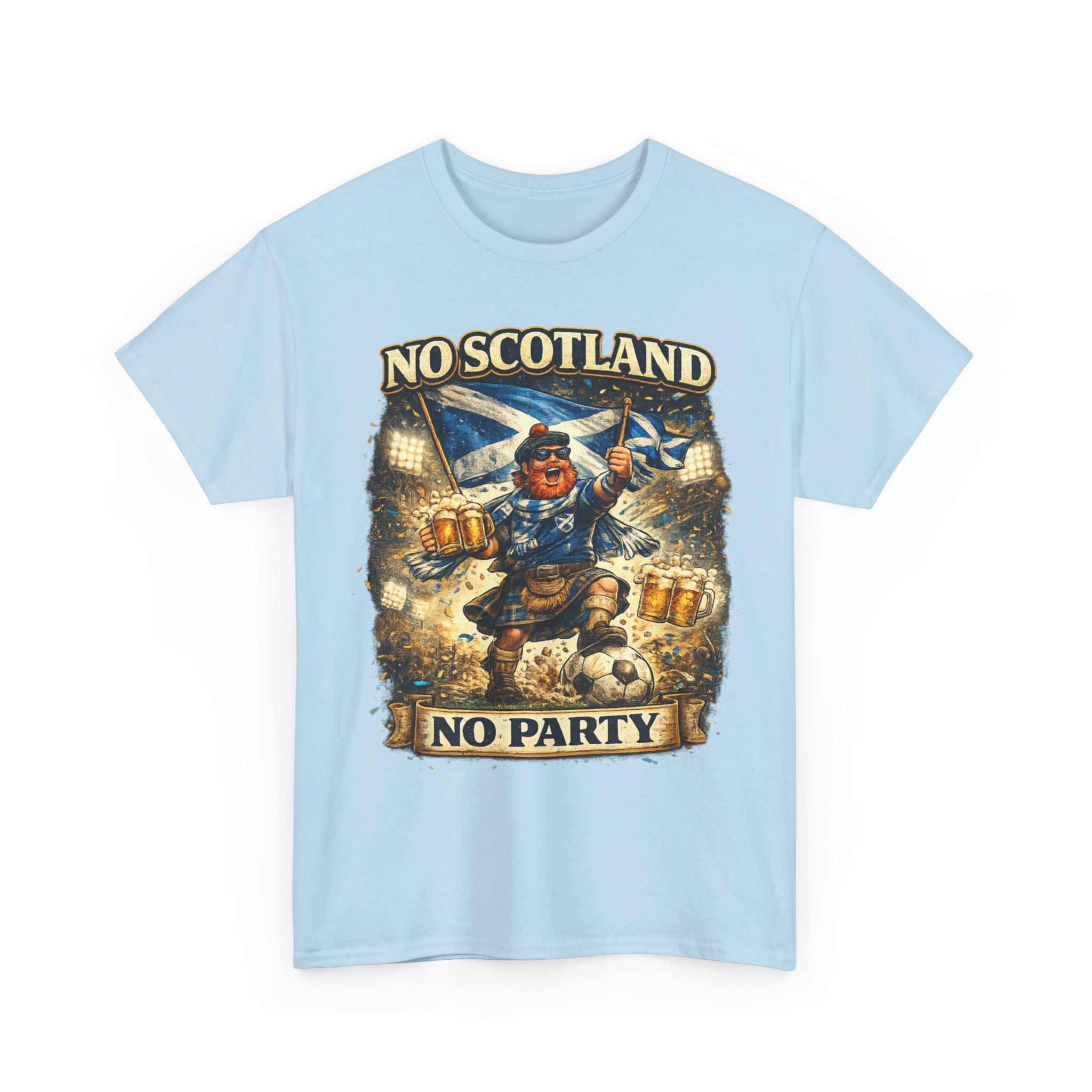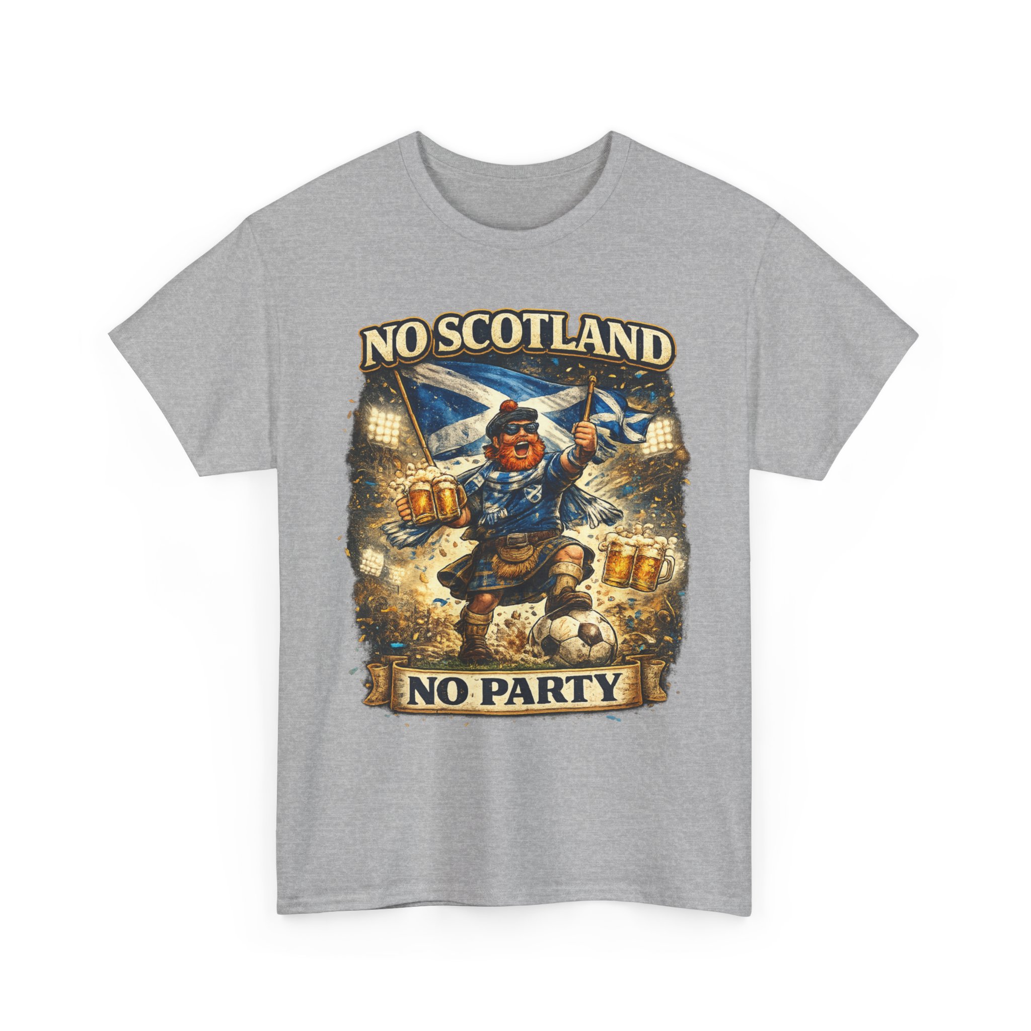 Bring the noise and the laughs with this No Scotland No Party football fan shirt, inspired by one of the most iconic chants from the Tartan Army. Featuring a bold, humorous supporter illustration with a kilted Scottish fan, beer mugs, and football energy, this shirt is perfect for showing your pride for Scotland wherever you watch the match.