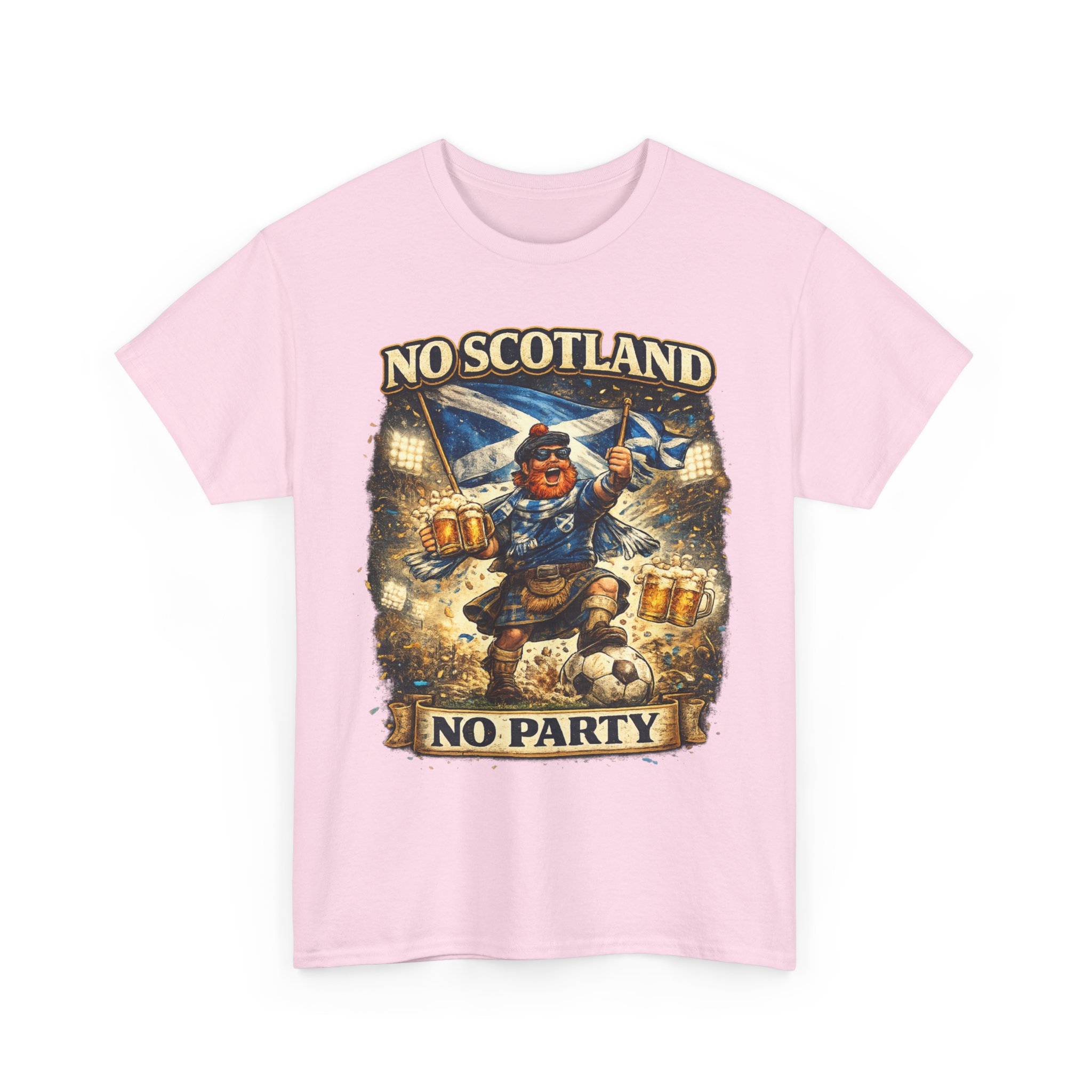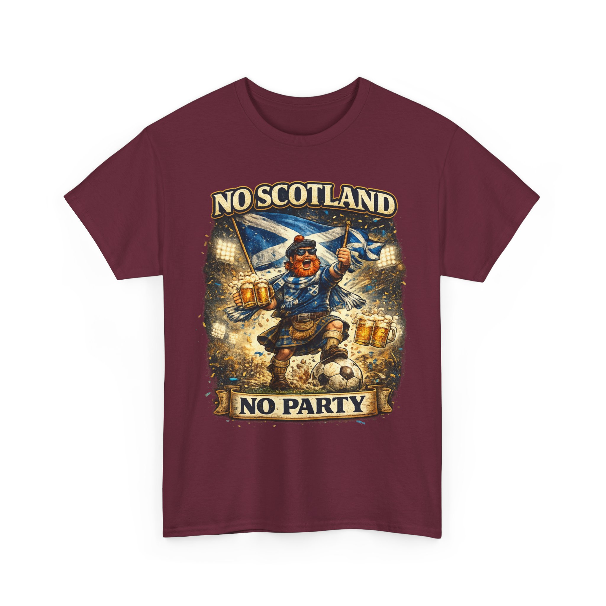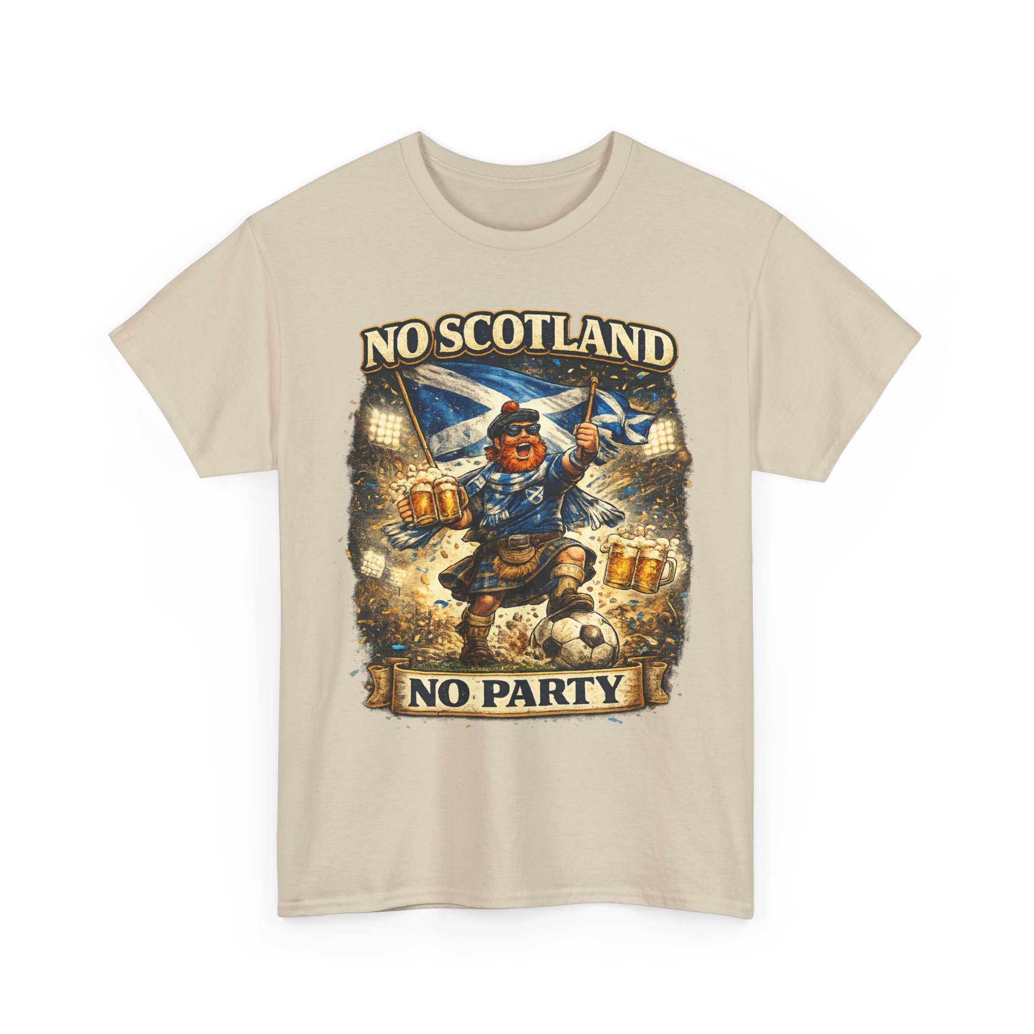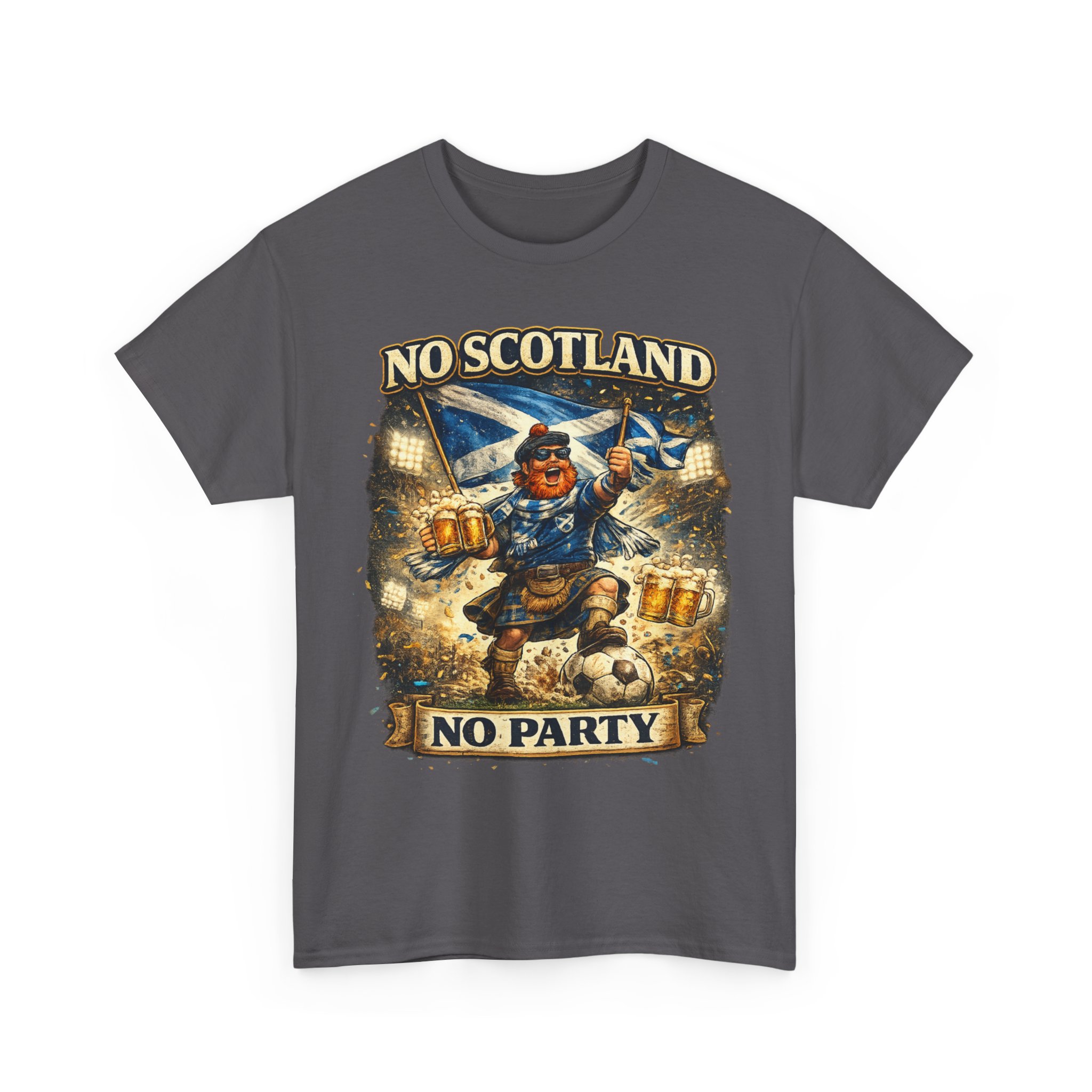 Bring the noise and the laughs with this No Scotland No Party football fan shirt, inspired by one of the most iconic chants from the Tartan Army. Featuring a bold, humorous supporter illustration with a kilted Scottish fan, beer mugs, and football energy, this shirt is perfect for showing your pride for Scotland wherever you watch the match.