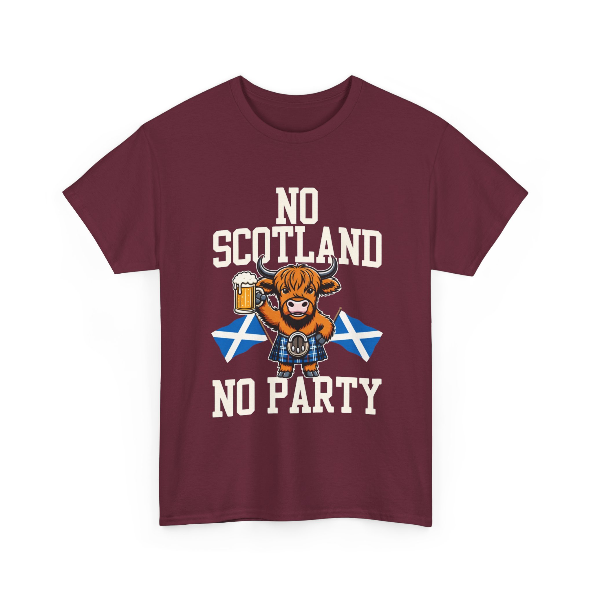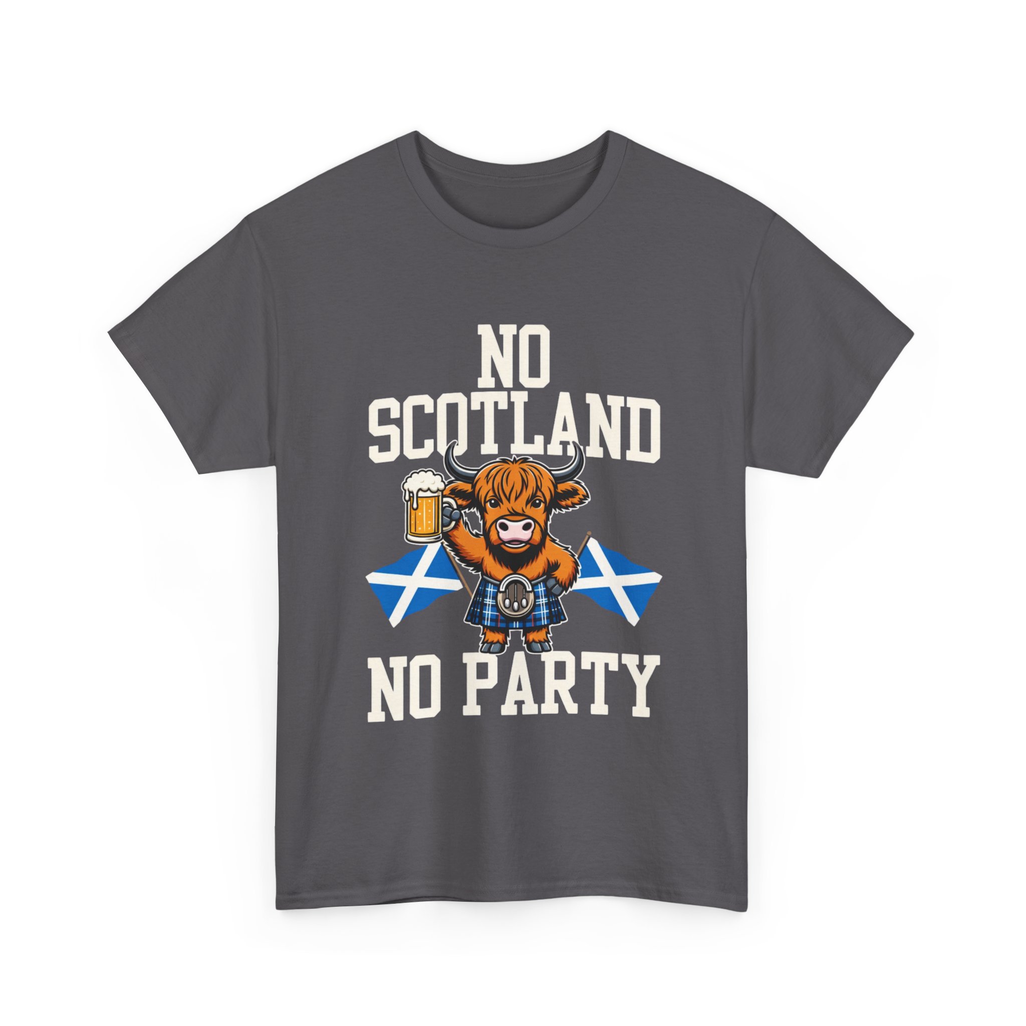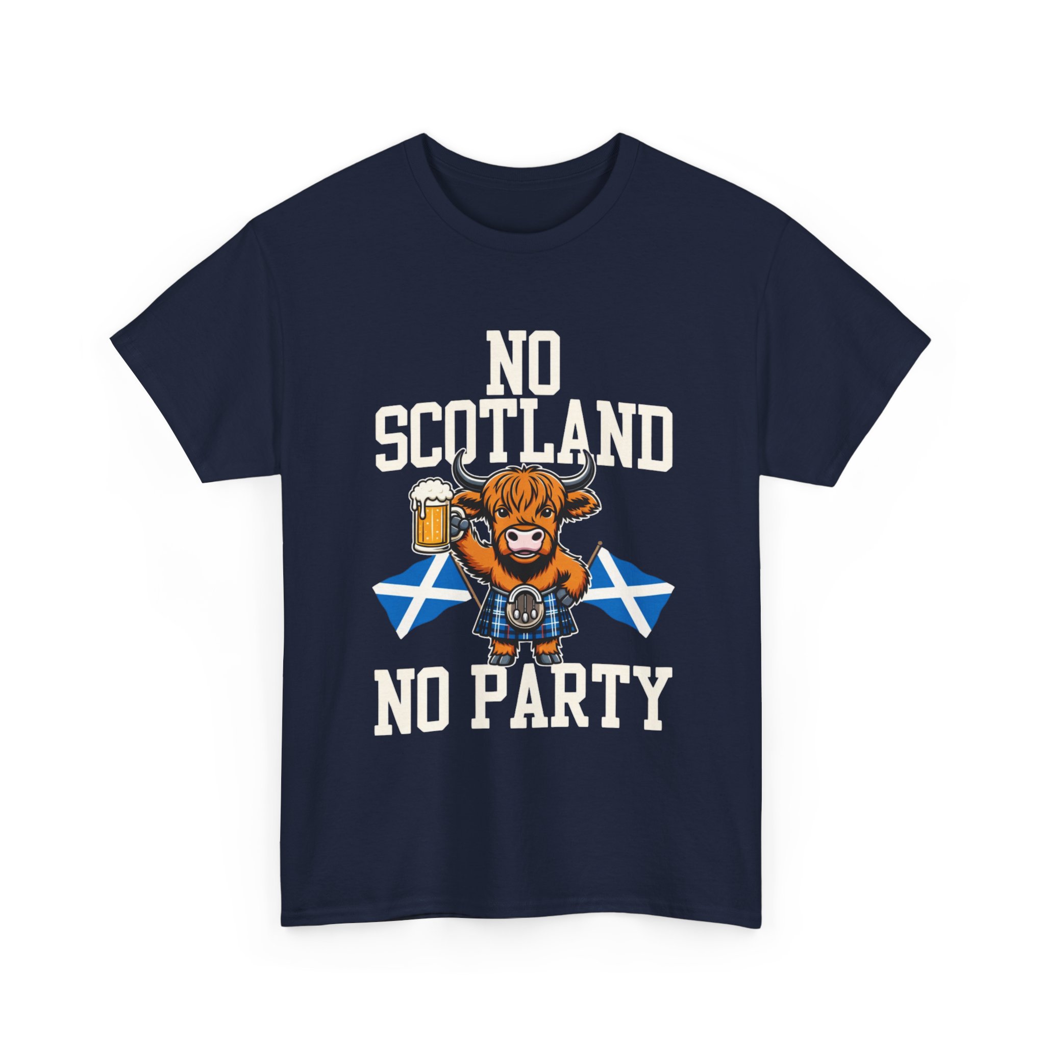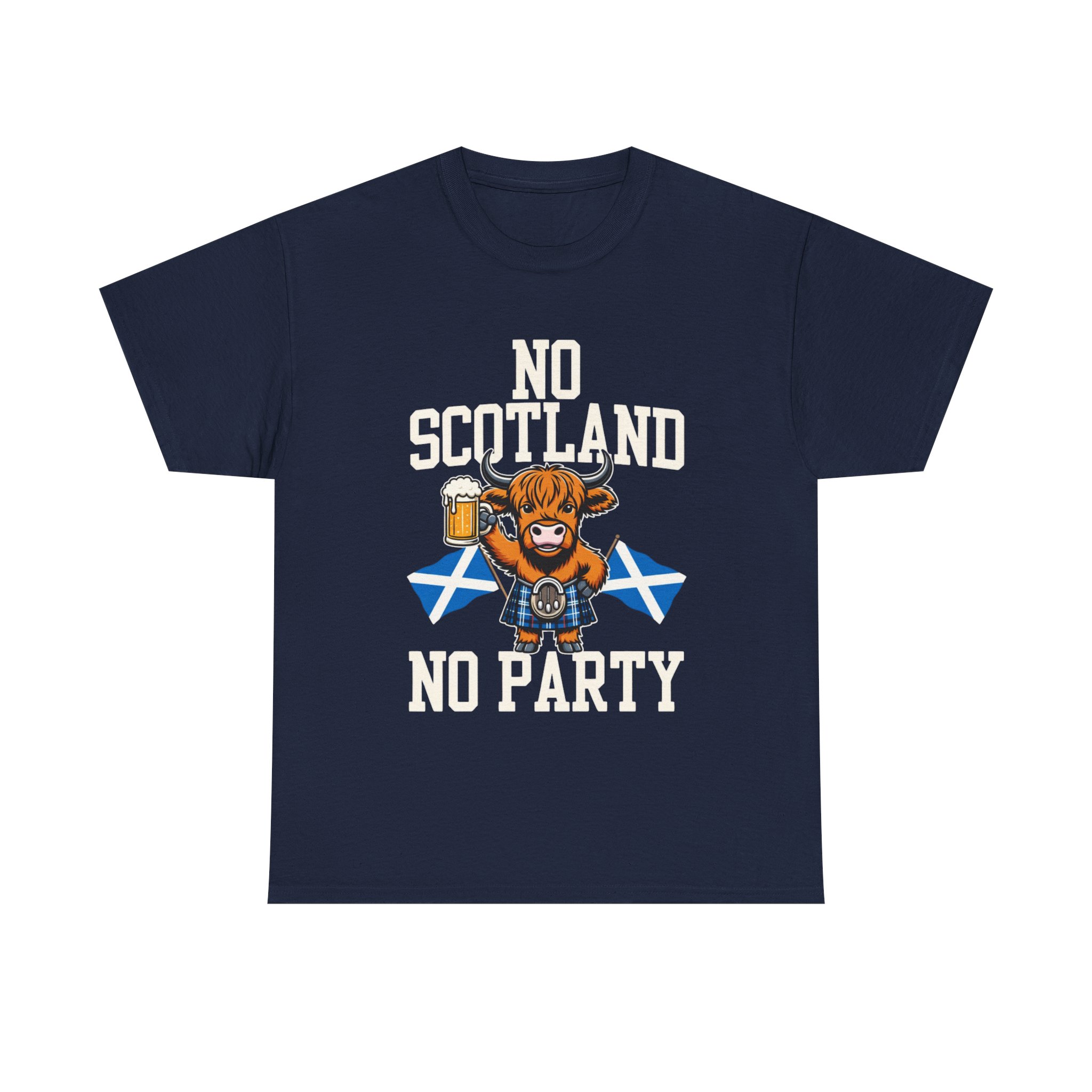 Bring a bit of Highland humor and heart to your wardrobe with this relaxed-fit tee. A grinning Highland cow clutching a pint and standing before crossed Saltire flags makes a bold, playful statement: No Scotland, No Party. The design sits comfortable and crisp on the chest, printed using a mix of DTF (sleeves/labels) and DTG methods so colors stay vivid through washes. The medium-weight cotton fabric and classic crew neckline give this shirt a timeless feel — wear it to a ceilidh, a pub crawl, or any day you want to celebrate Scottish pride with a wink. Soft on the skin, sturdy in the weave, and simple to style with jeans or layered under a jacket.