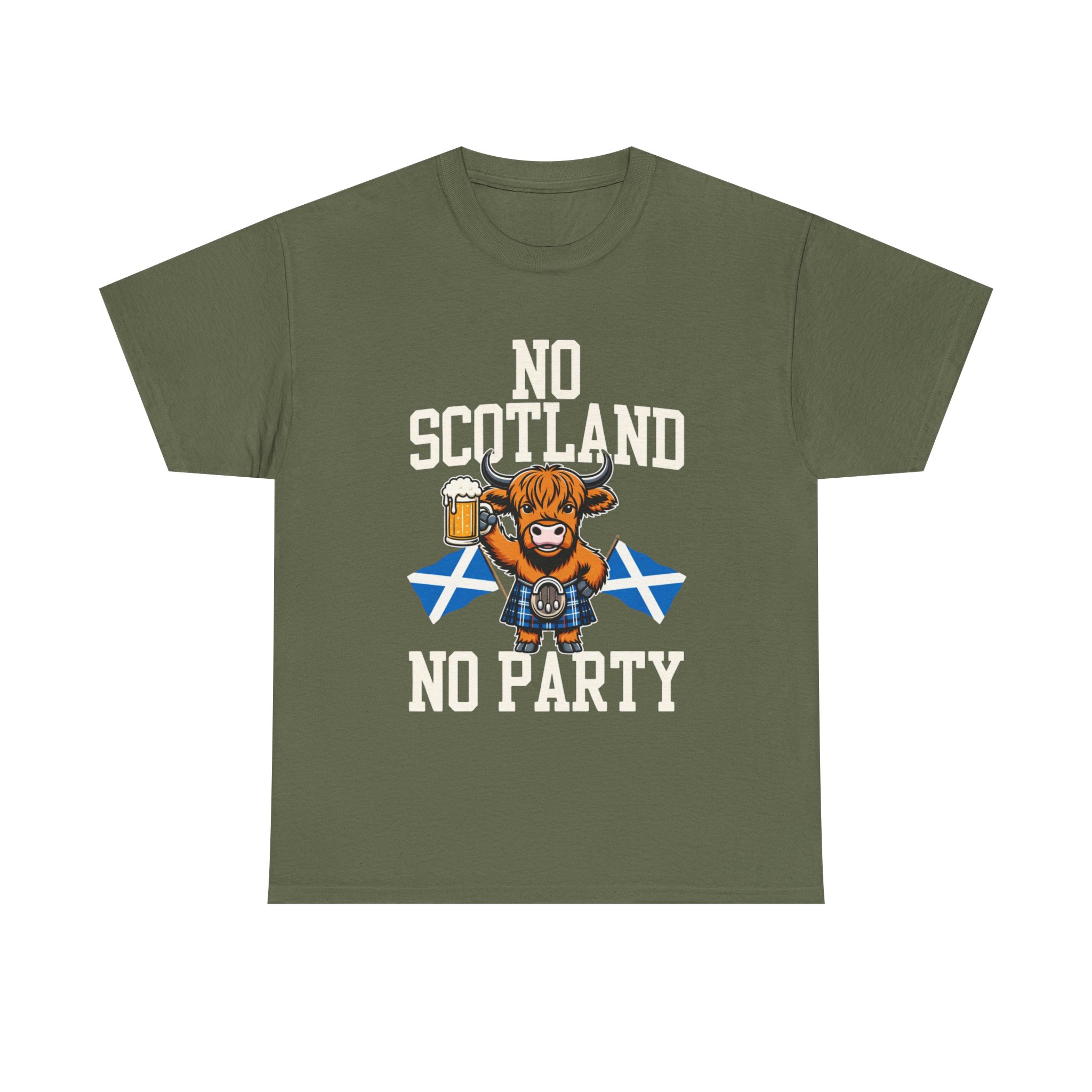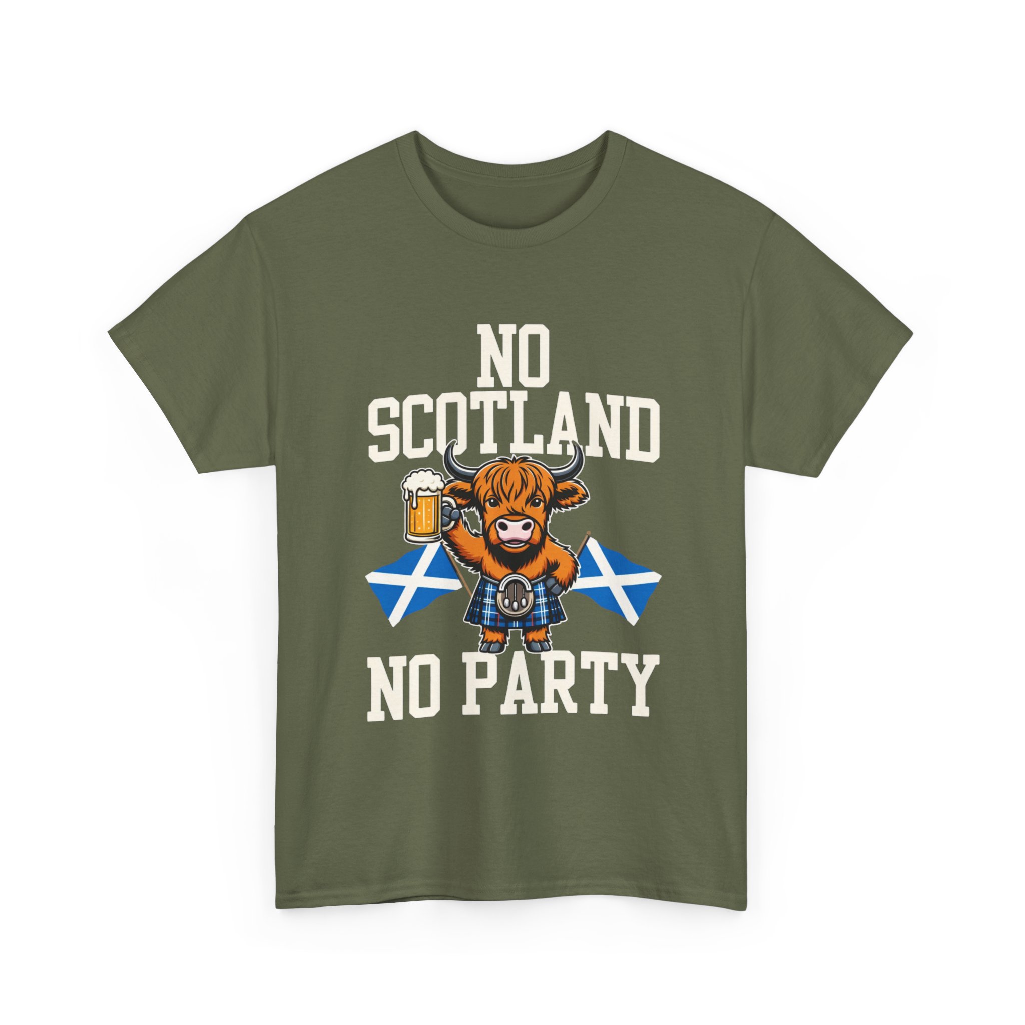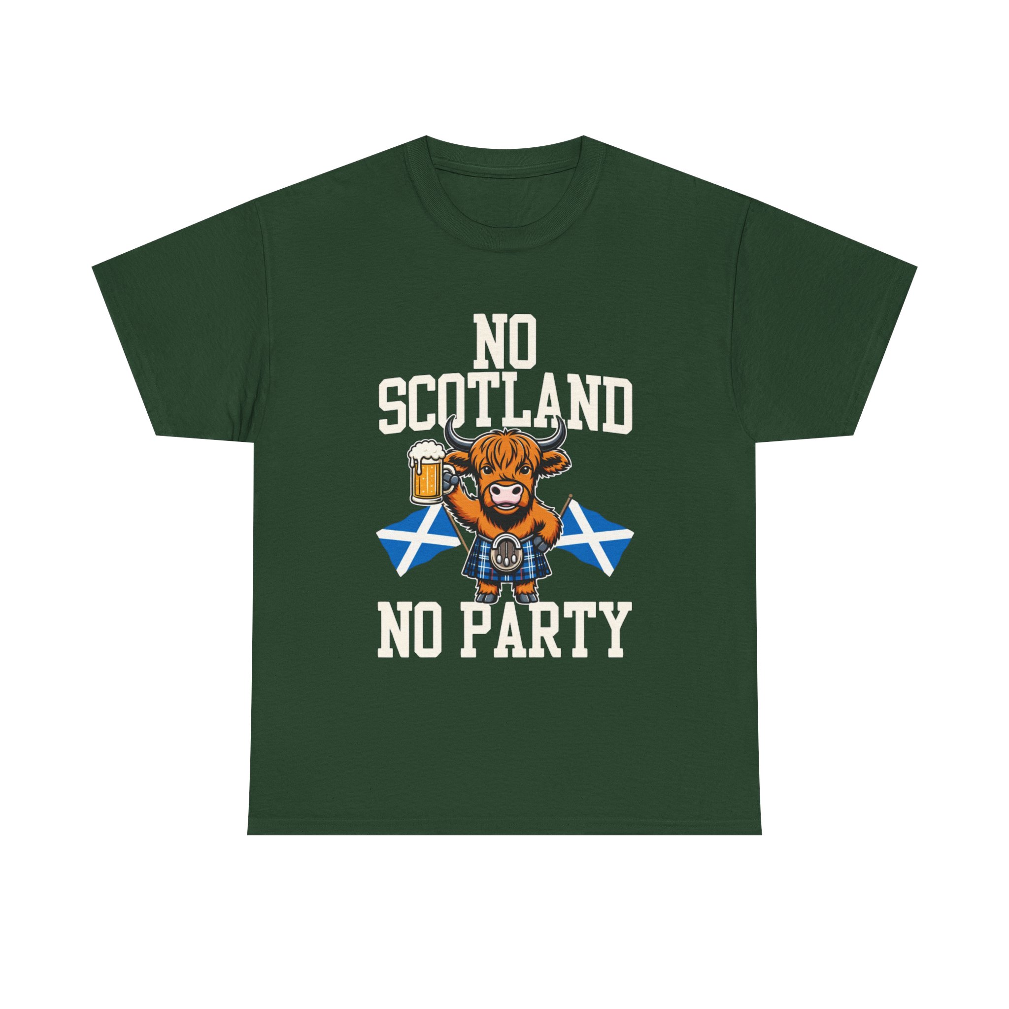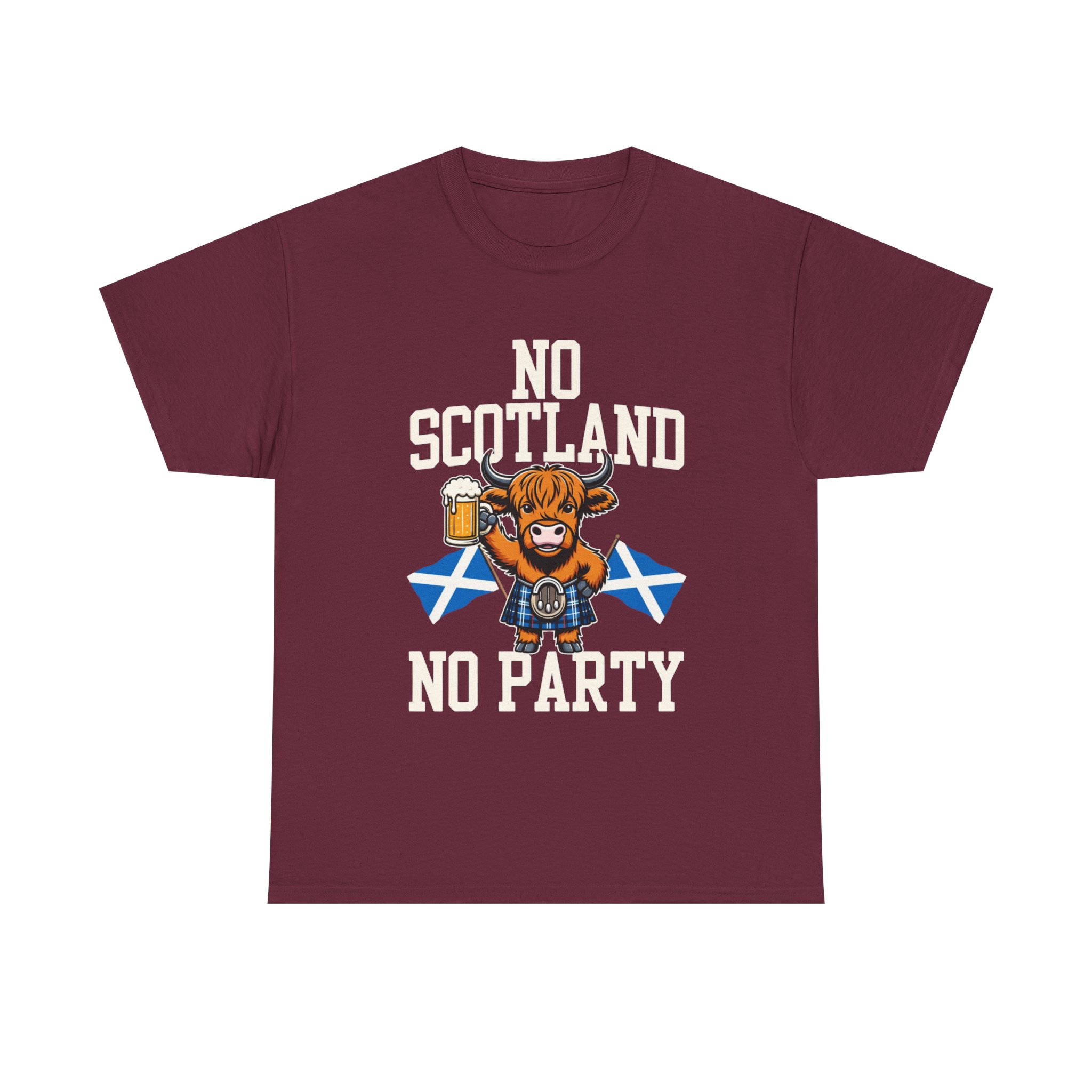 Bring a bit of Highland humor and heart to your wardrobe with this relaxed-fit tee. A grinning Highland cow clutching a pint and standing before crossed Saltire flags makes a bold, playful statement: No Scotland, No Party. The design sits comfortable and crisp on the chest, printed using a mix of DTF (sleeves/labels) and DTG methods so colors stay vivid through washes. The medium-weight cotton fabric and classic crew neckline give this shirt a timeless feel — wear it to a ceilidh, a pub crawl, or any day you want to celebrate Scottish pride with a wink. Soft on the skin, sturdy in the weave, and simple to style with jeans or layered under a jacket.