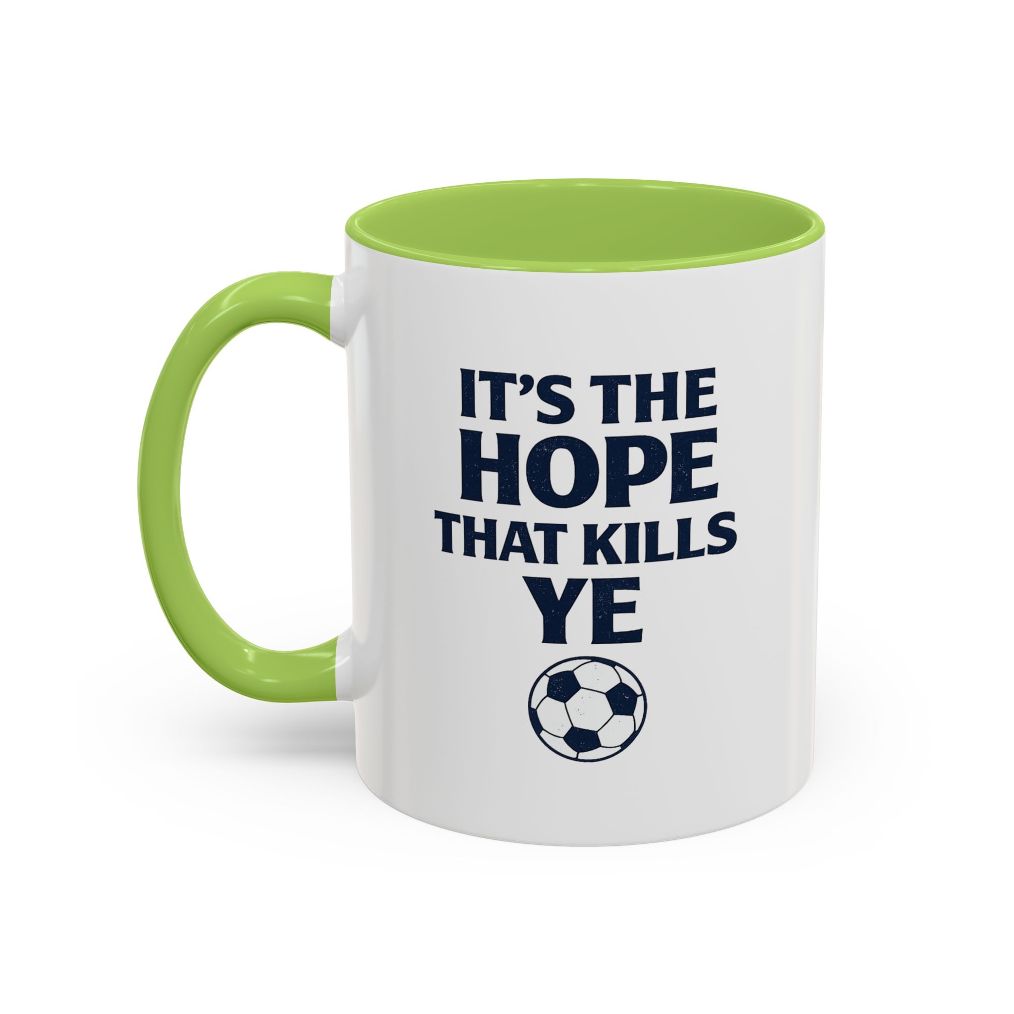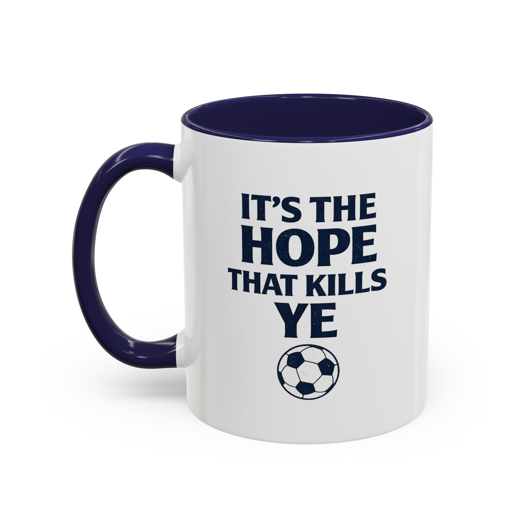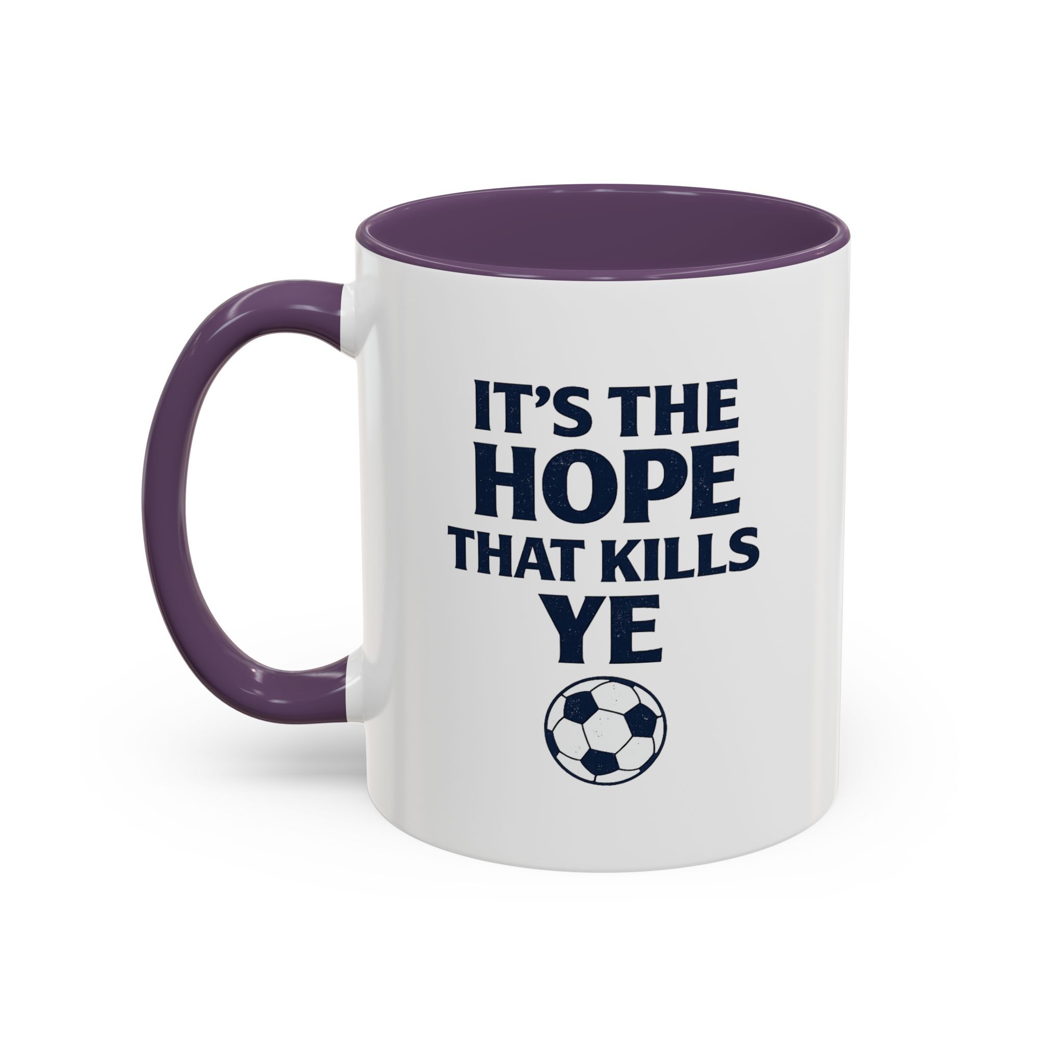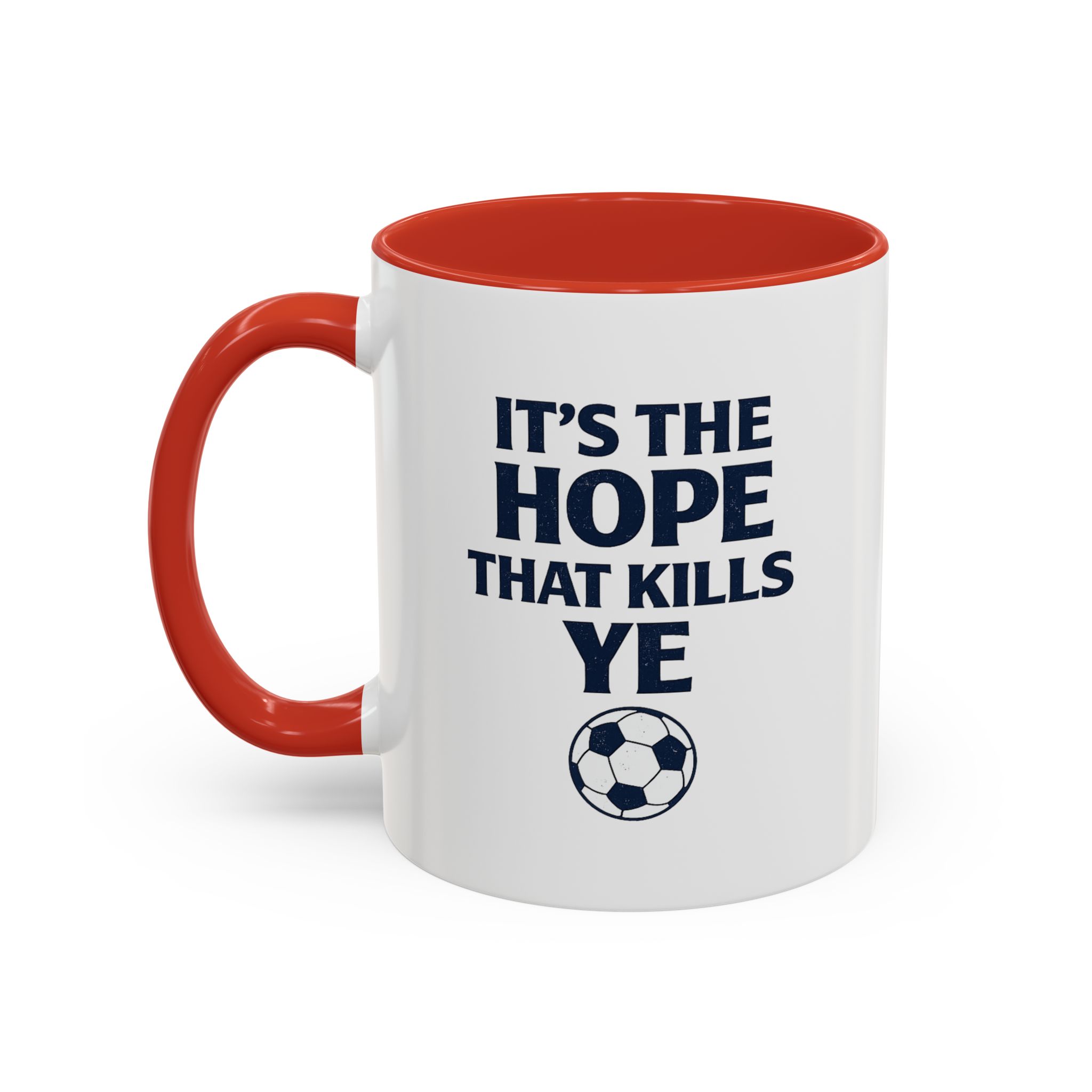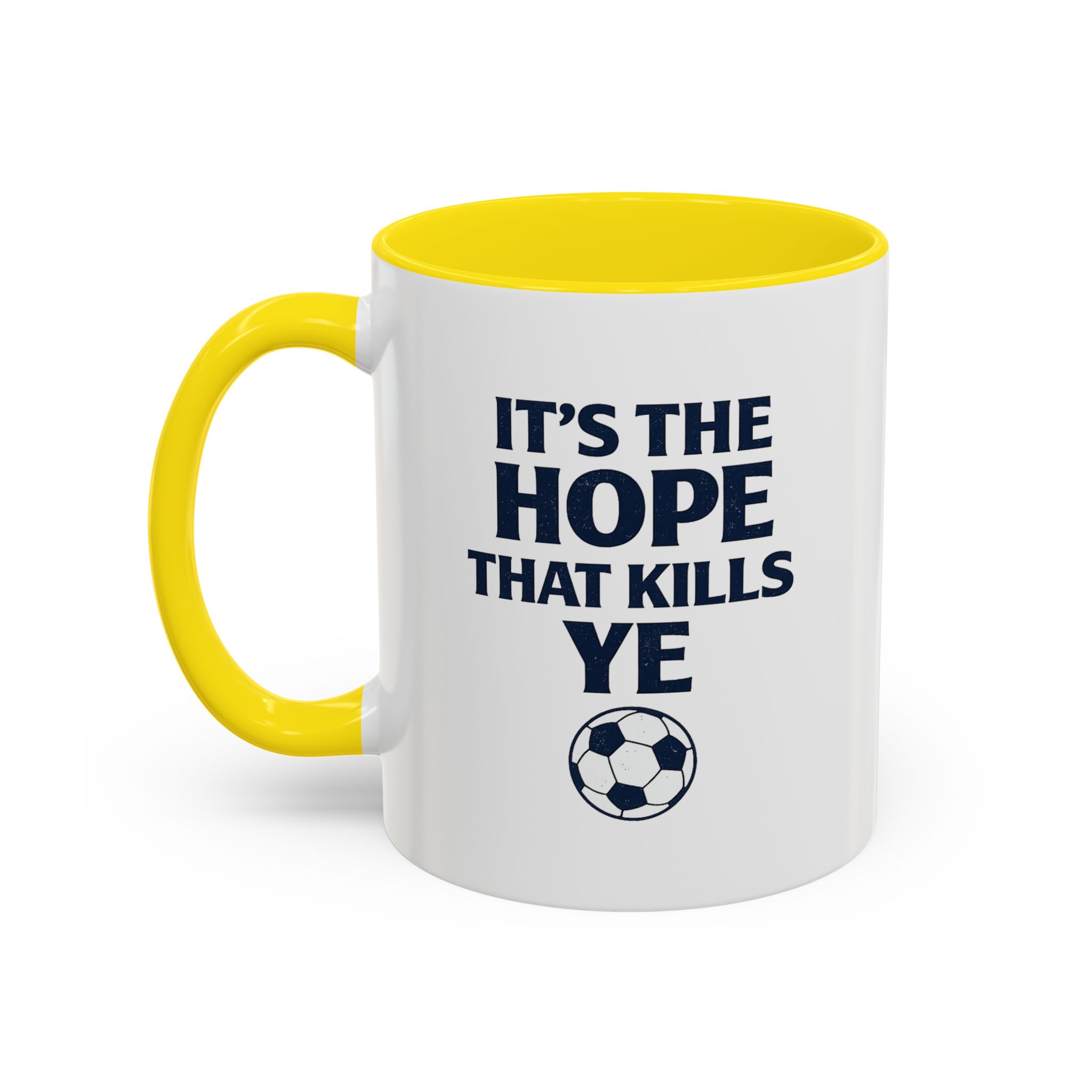 Show your love for Scottish football with this funny Scotland football mug featuring the classic fan phrase “It’s The Hope That Kills Ye.” Every member of the Tartan Army knows the emotional rollercoaster of supporting Scotland, making this mug the perfect daily reminder for passionate fans.