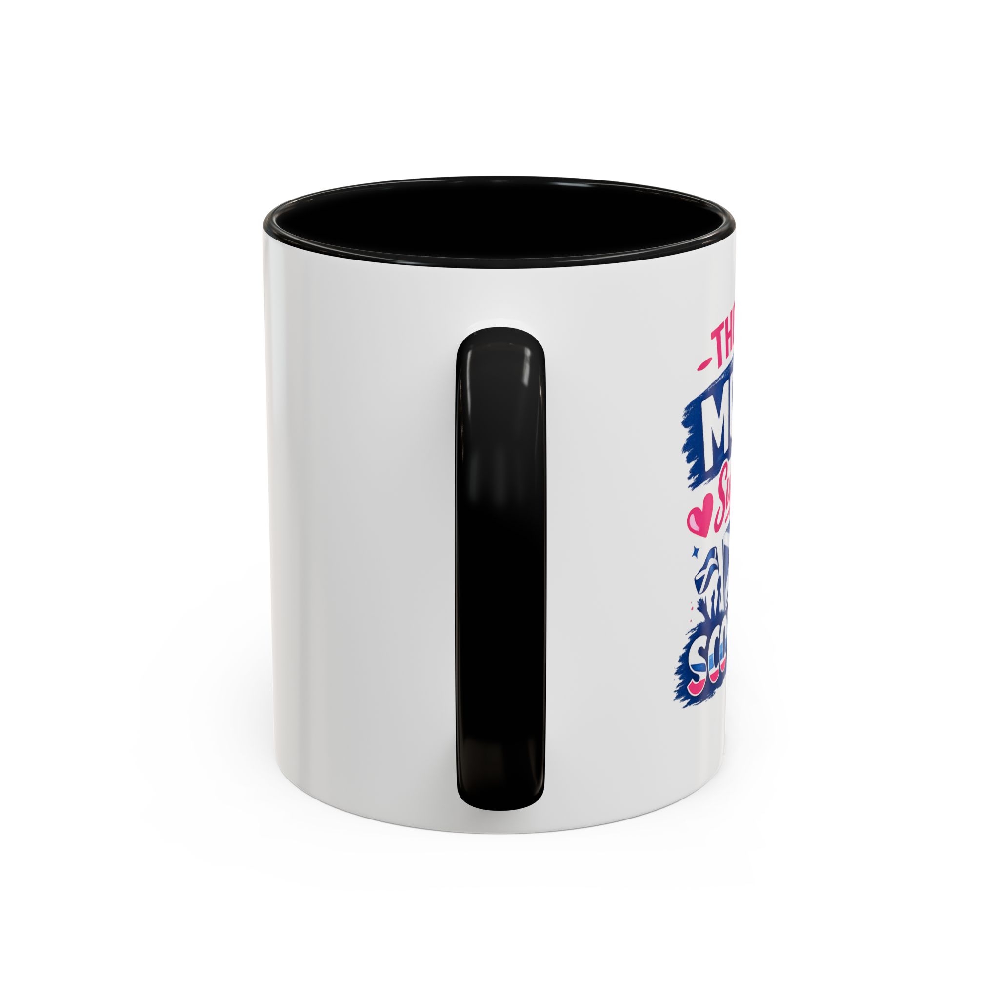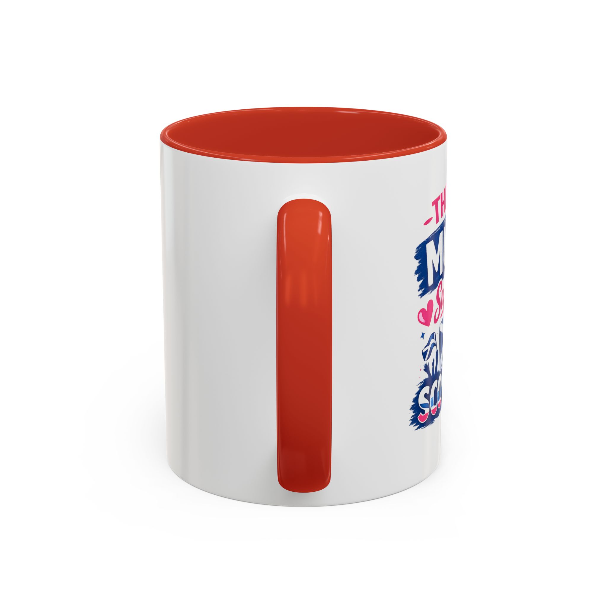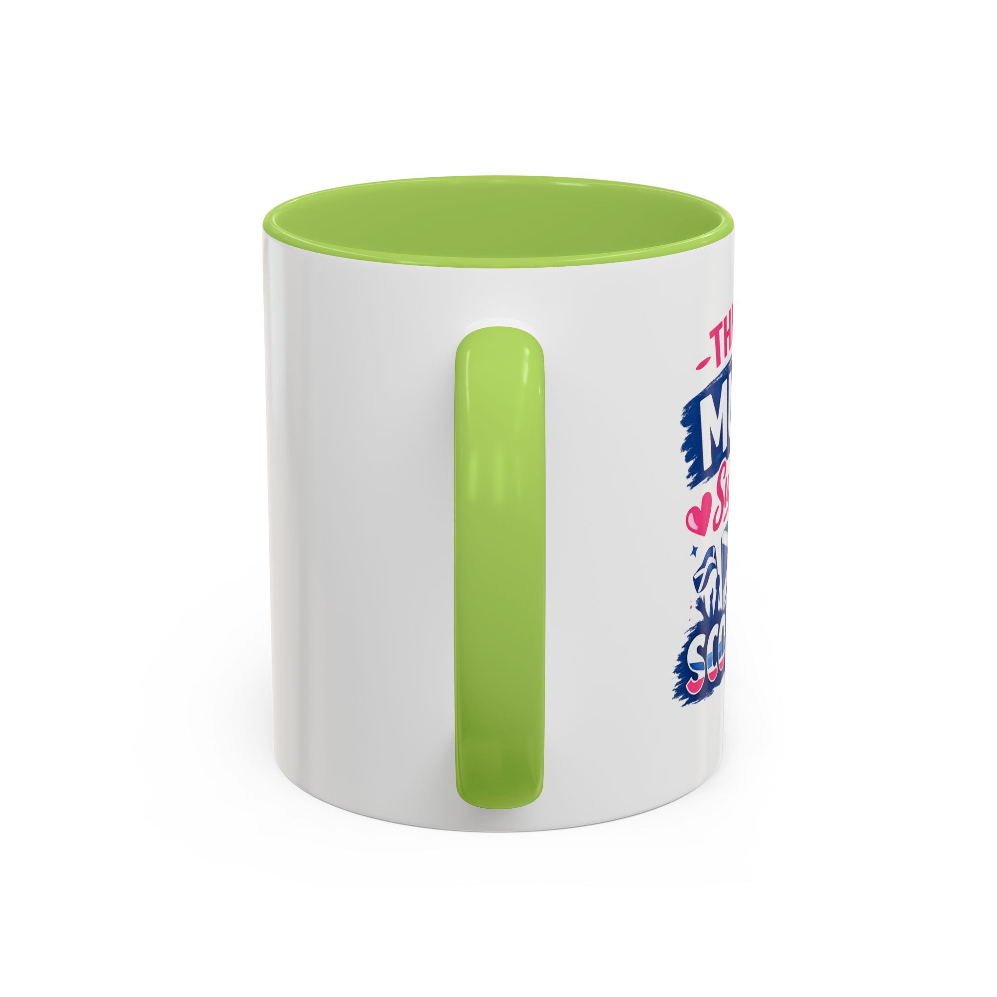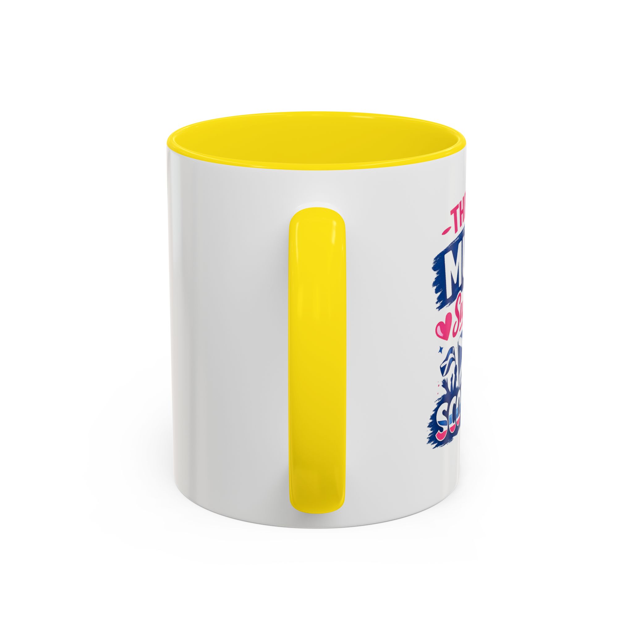 • White ceramic mug with colored interior and C-shaped handle