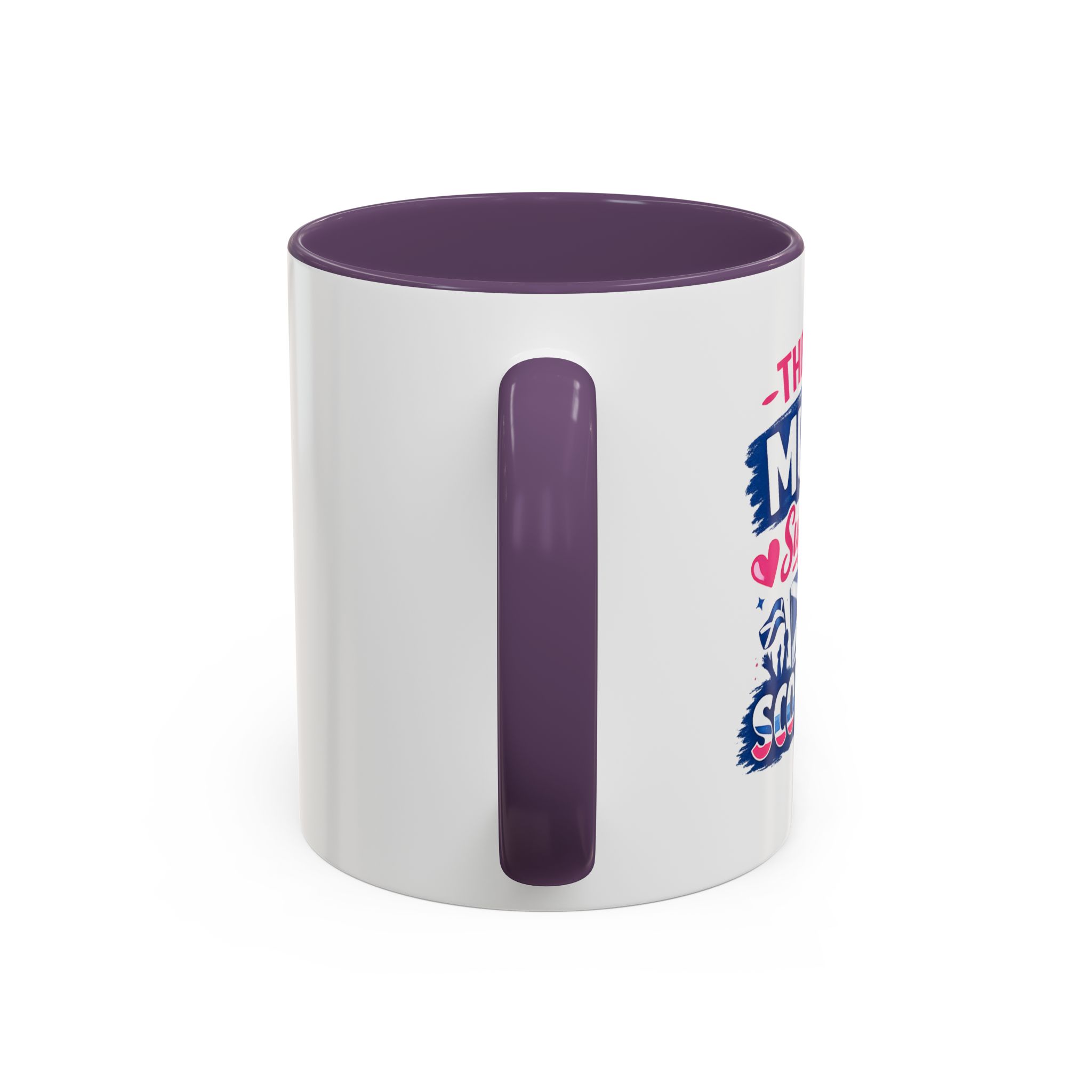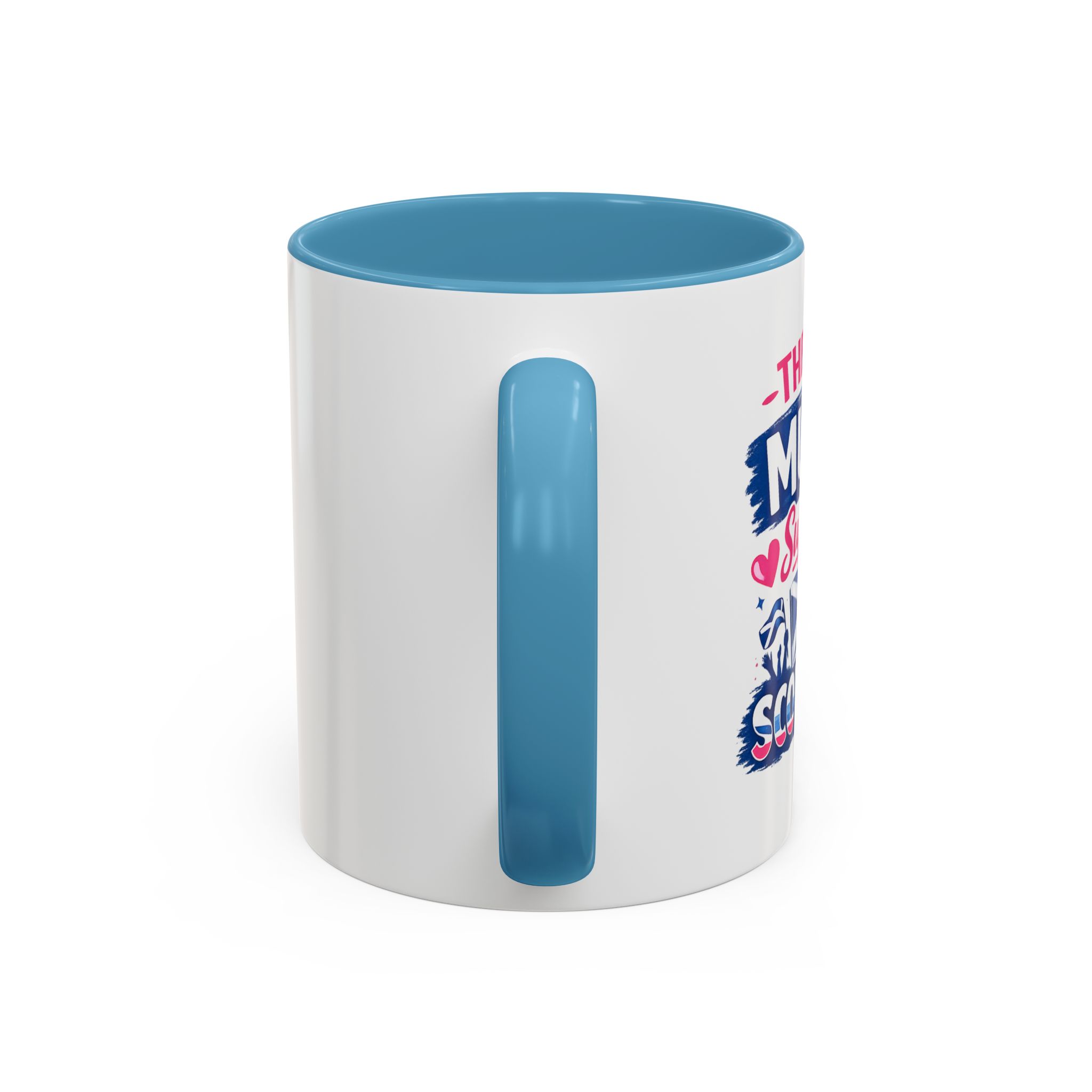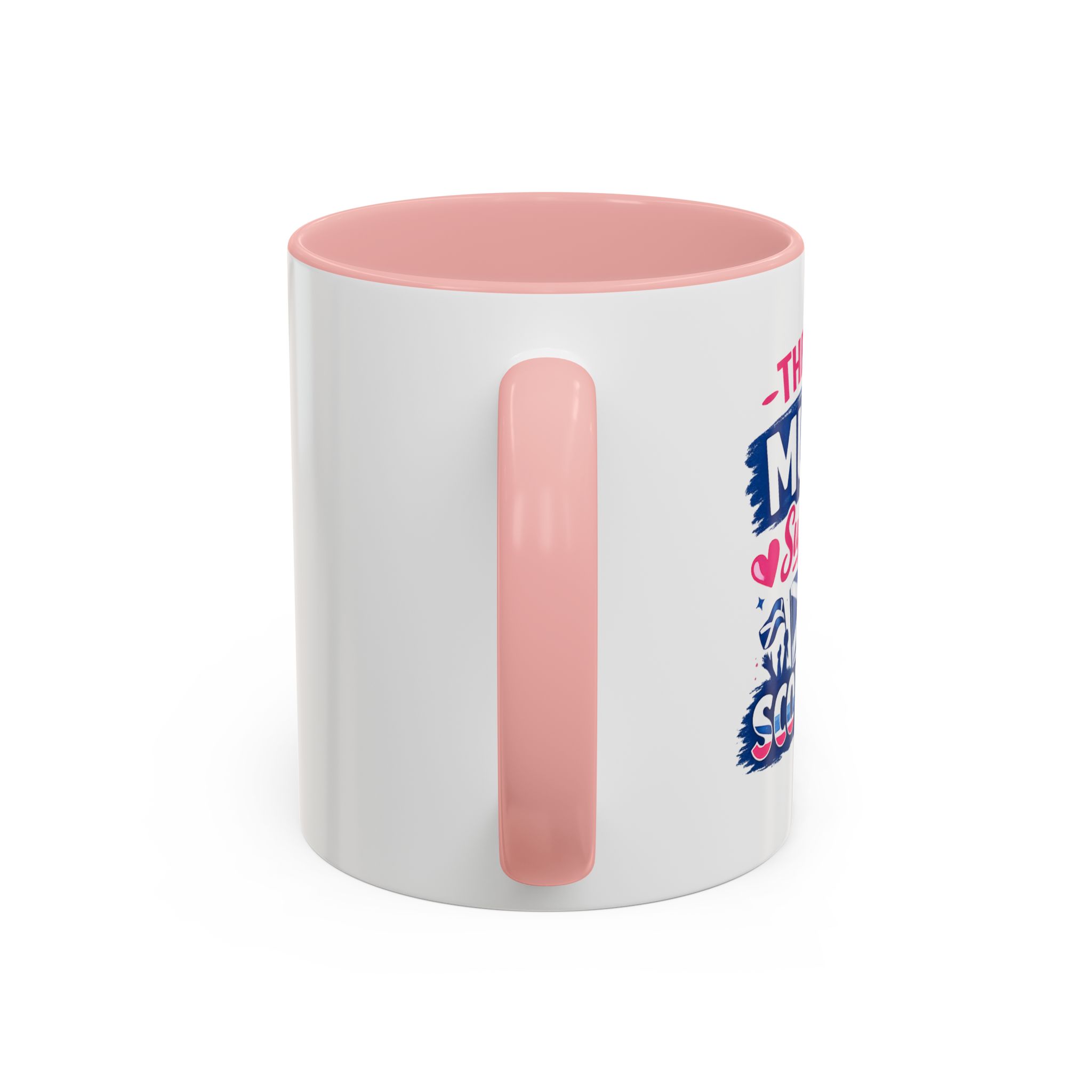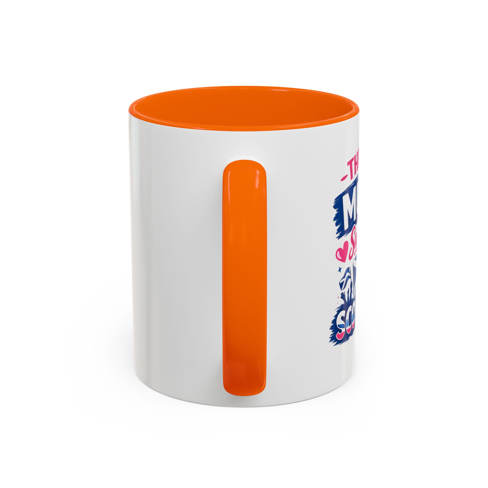 • White ceramic mug with colored interior and C-shaped handle