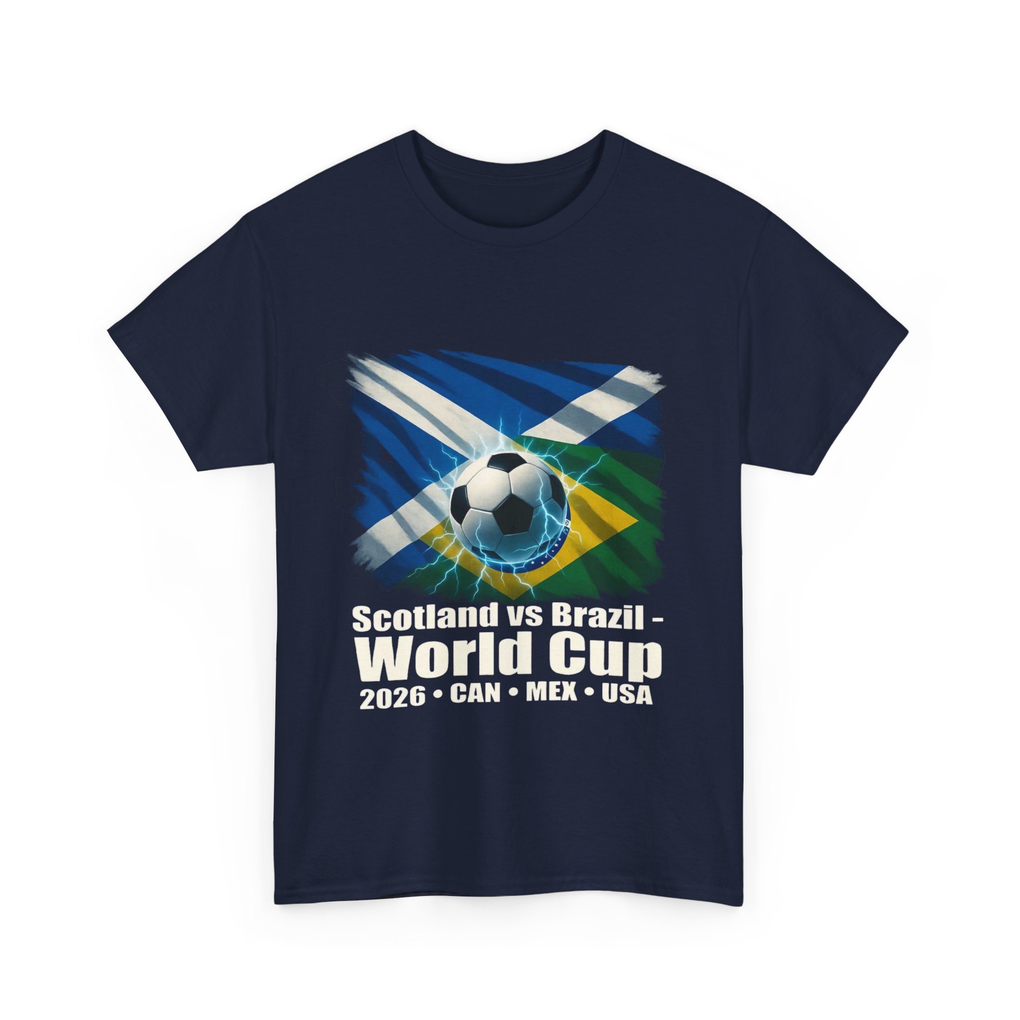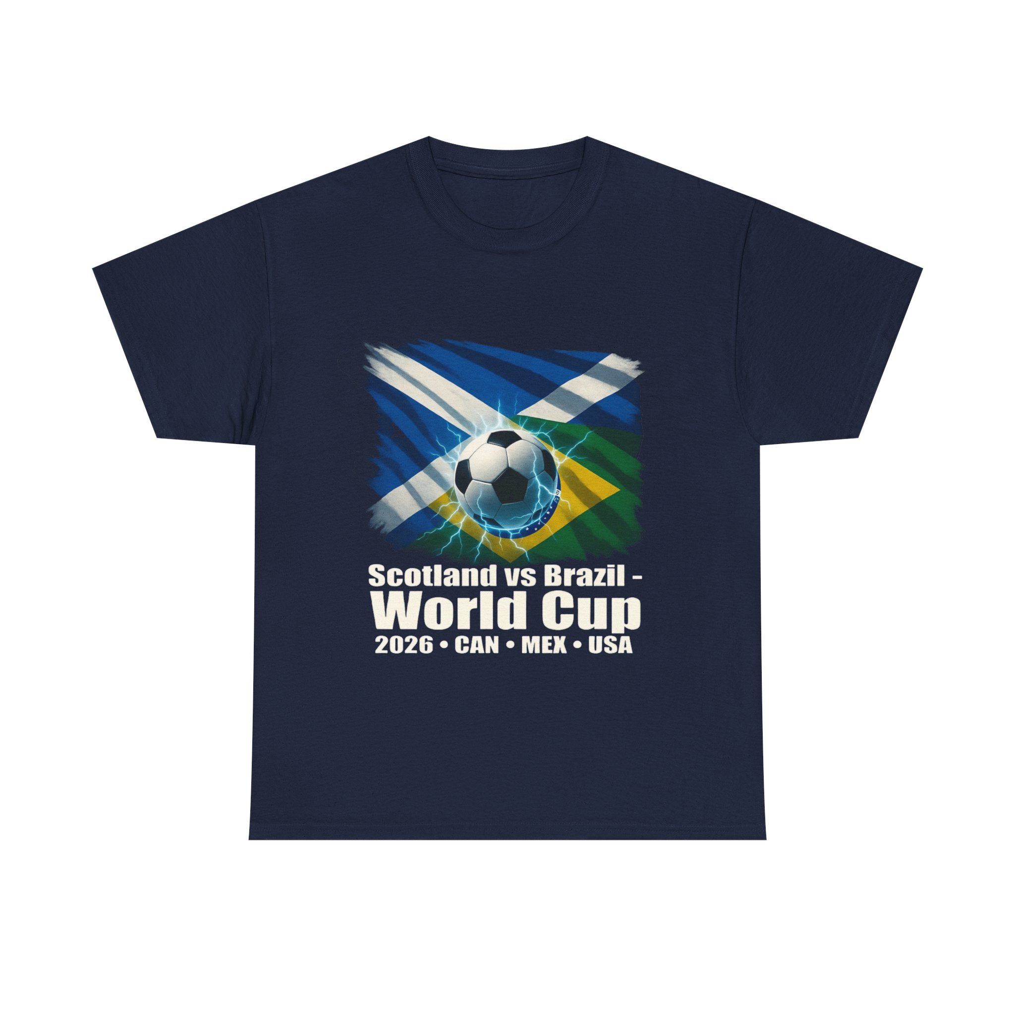 This T-shirt brings the excitement of World Cup 2026 (CAN • MEX • USA) into a bold, high-impact design built for true Scotland supporters. The artwork features Scotland and Brazil facing off, with a lightning-charged football exploding through the center and covering the Brazil flag text for a clean, powerful look.