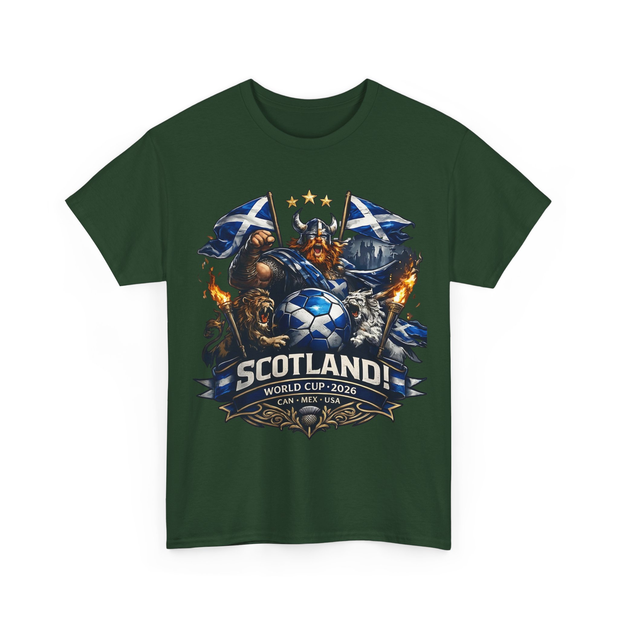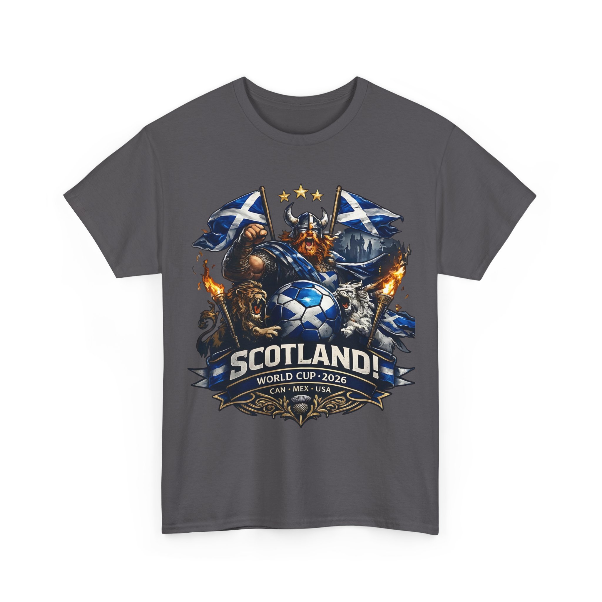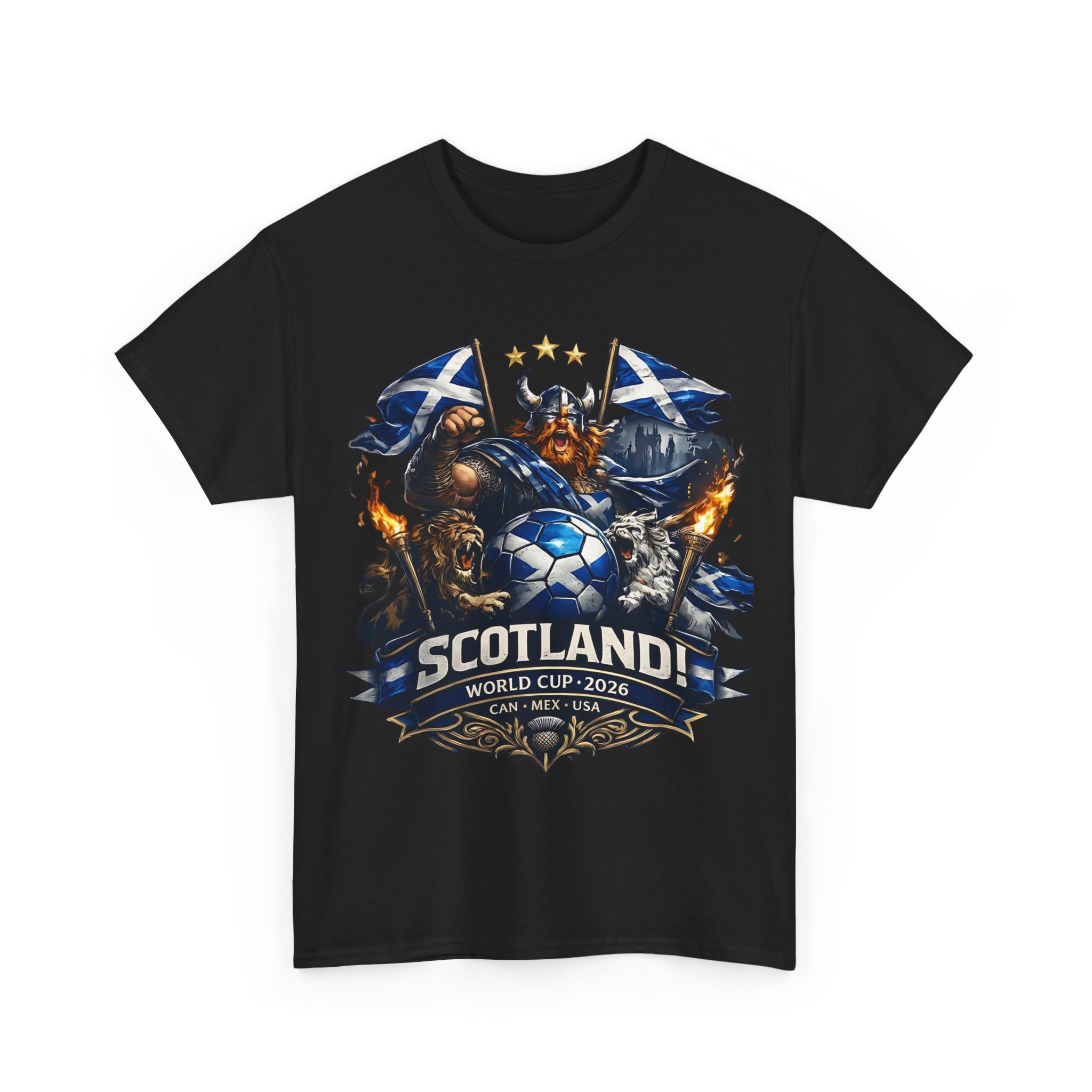 Stand with the Tartan Army in bold style. This powerful Scotland football design features a fierce Highland warrior, roaring lions, Saltire flags, and a dramatic soccer emblem — built for supporters who bring passion to every match.