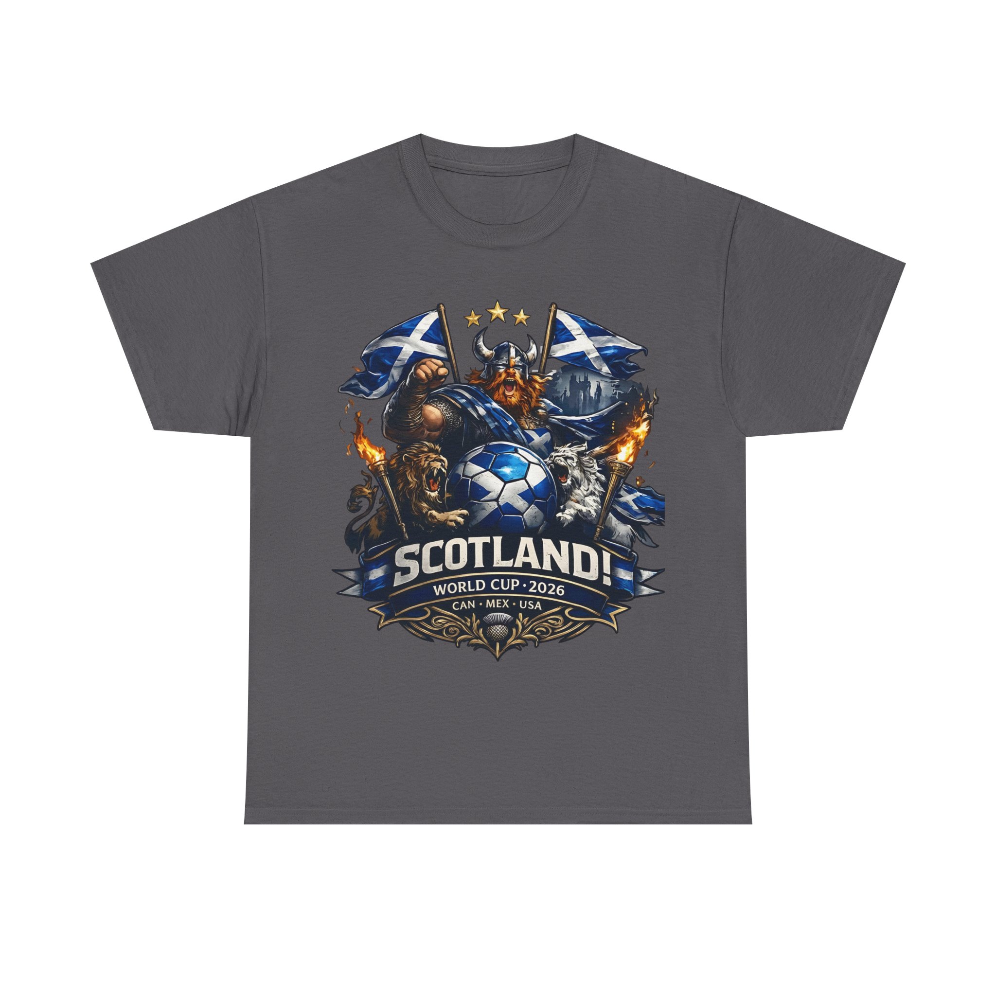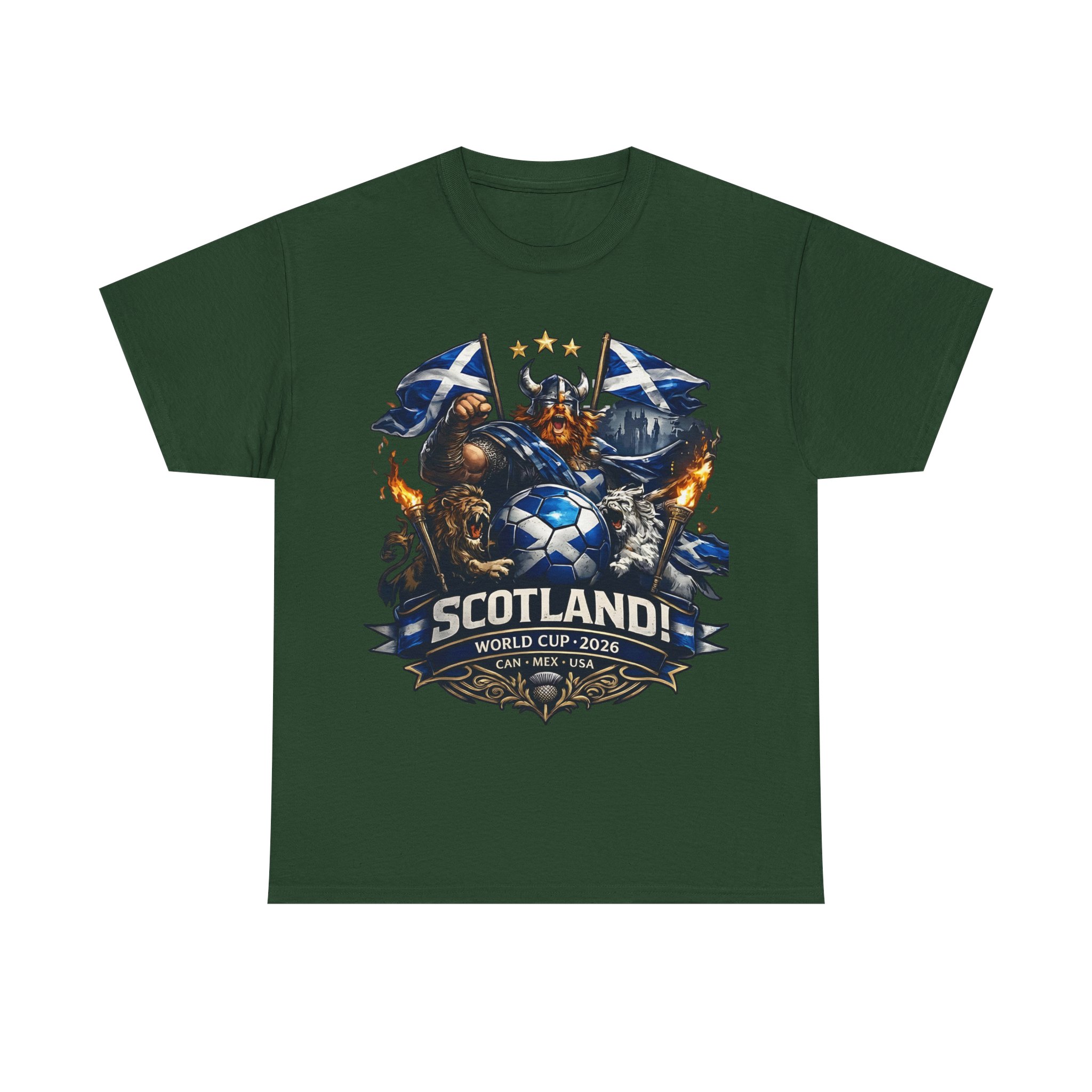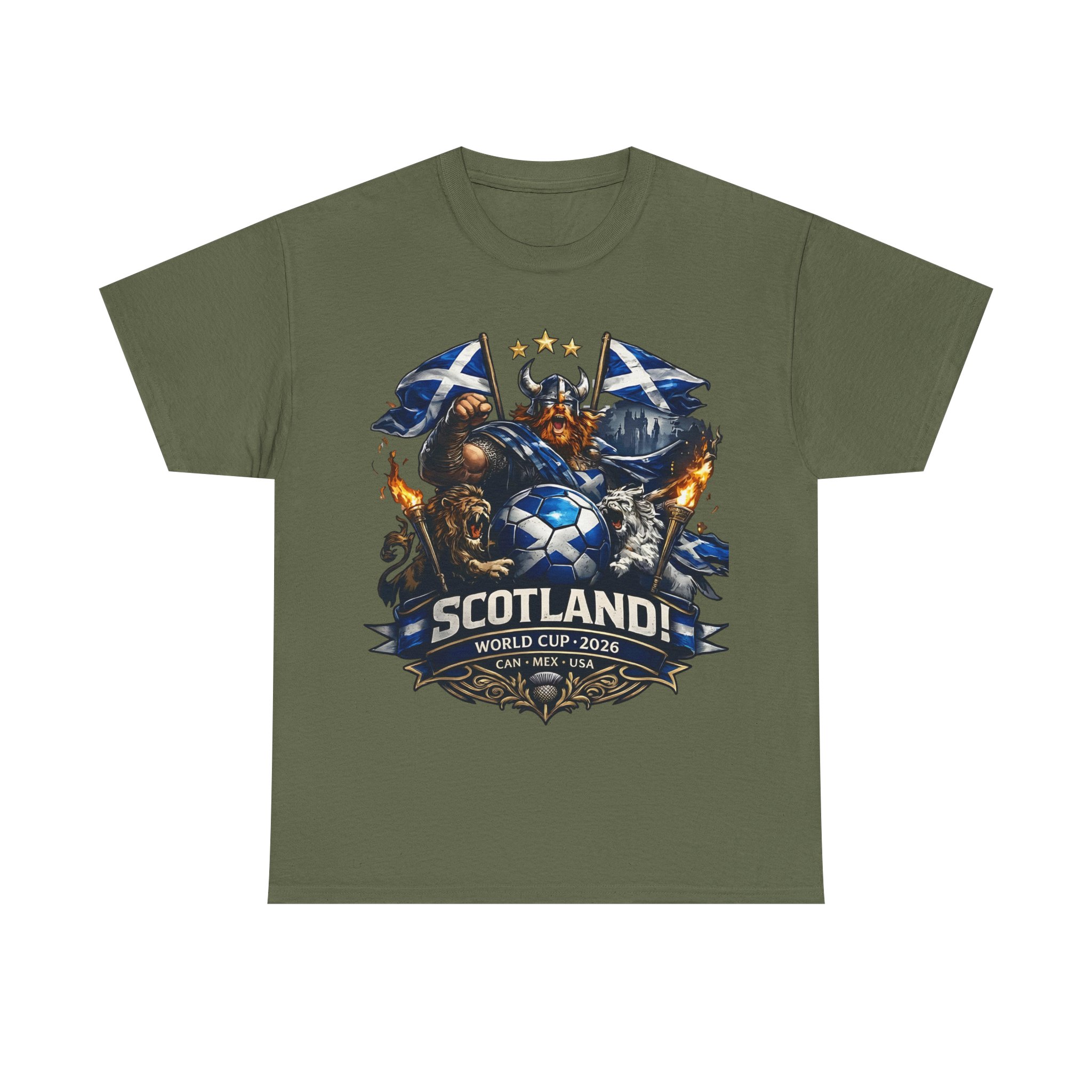 Stand with the Tartan Army in bold style. This powerful Scotland football design features a fierce Highland warrior, roaring lions, Saltire flags, and a dramatic soccer emblem — built for supporters who bring passion to every match.