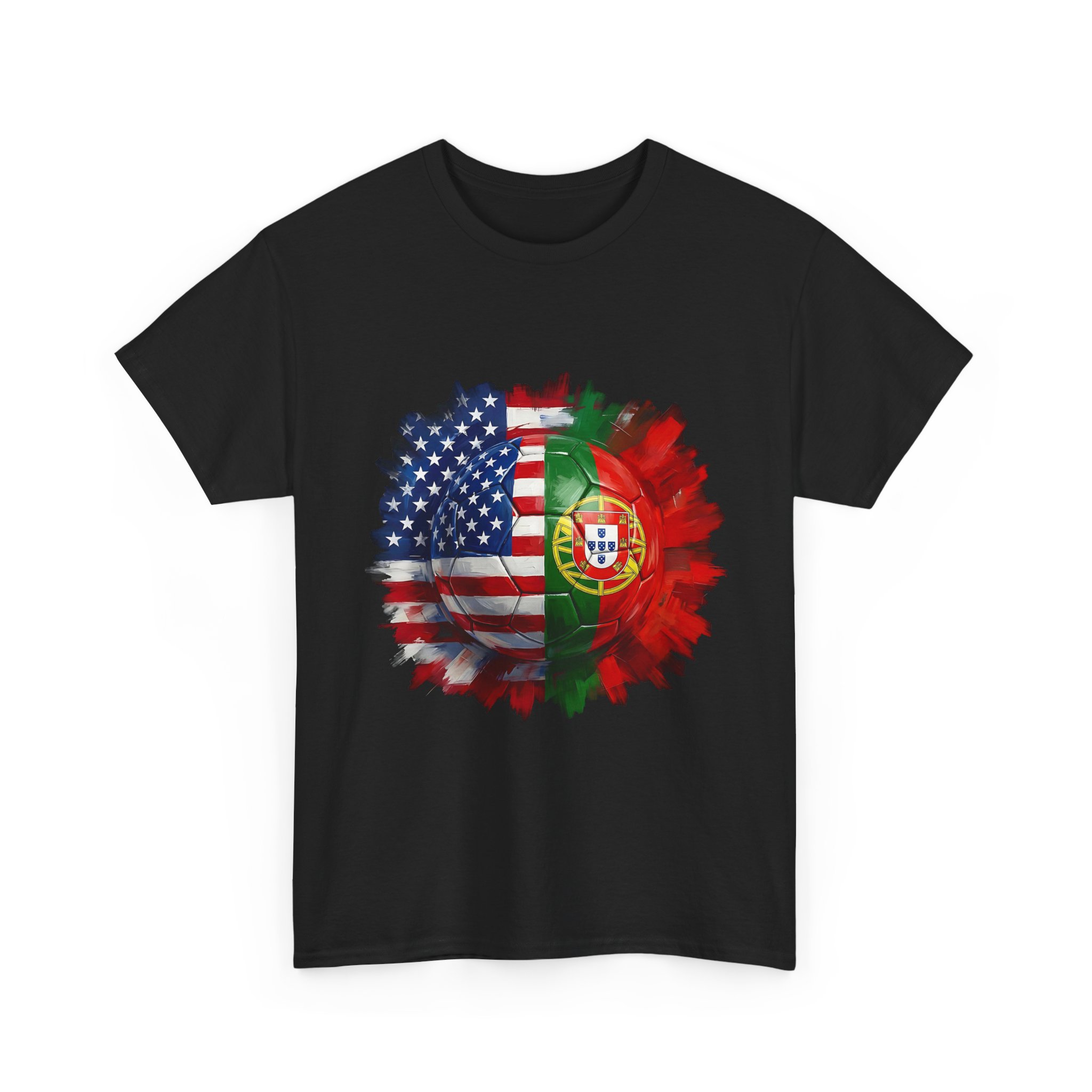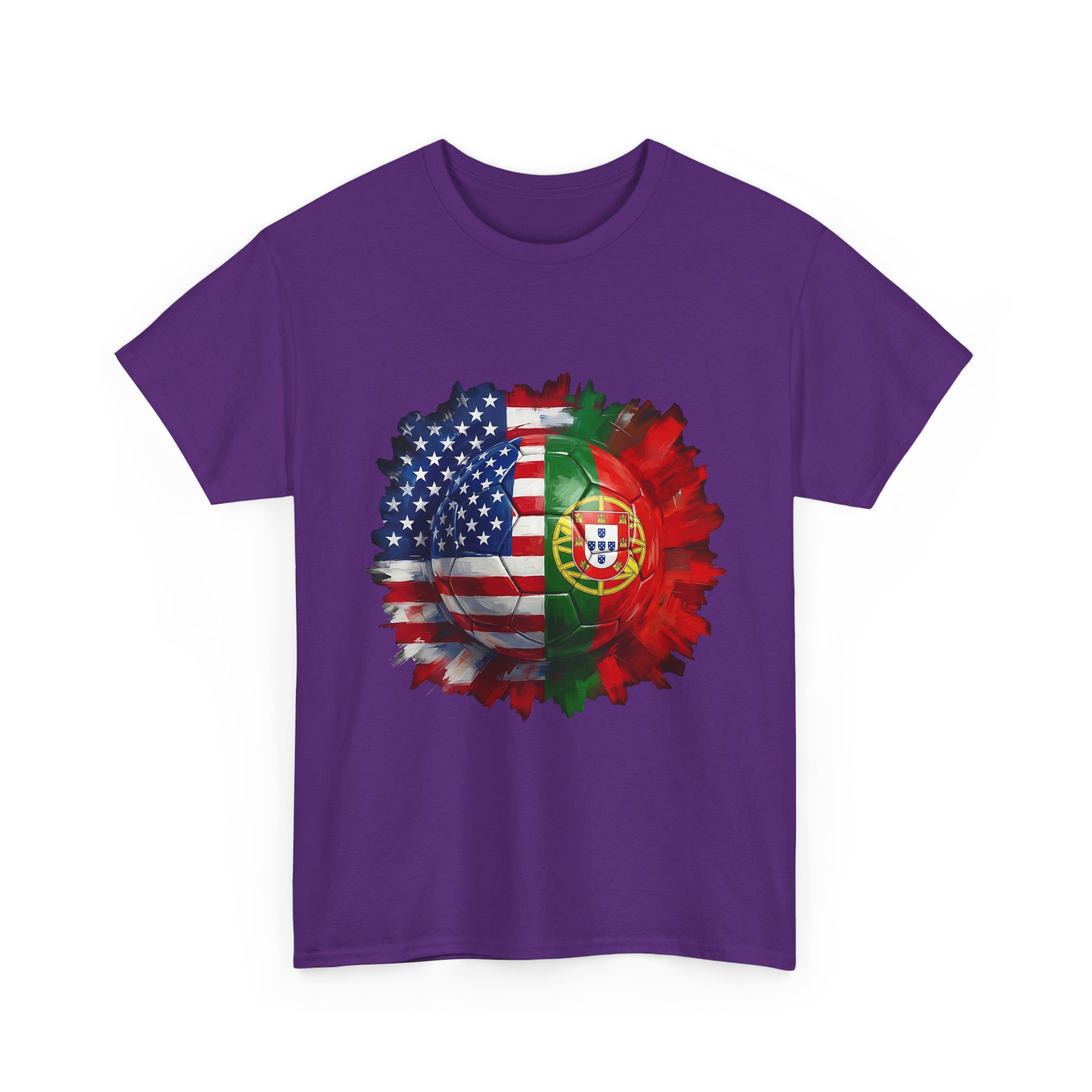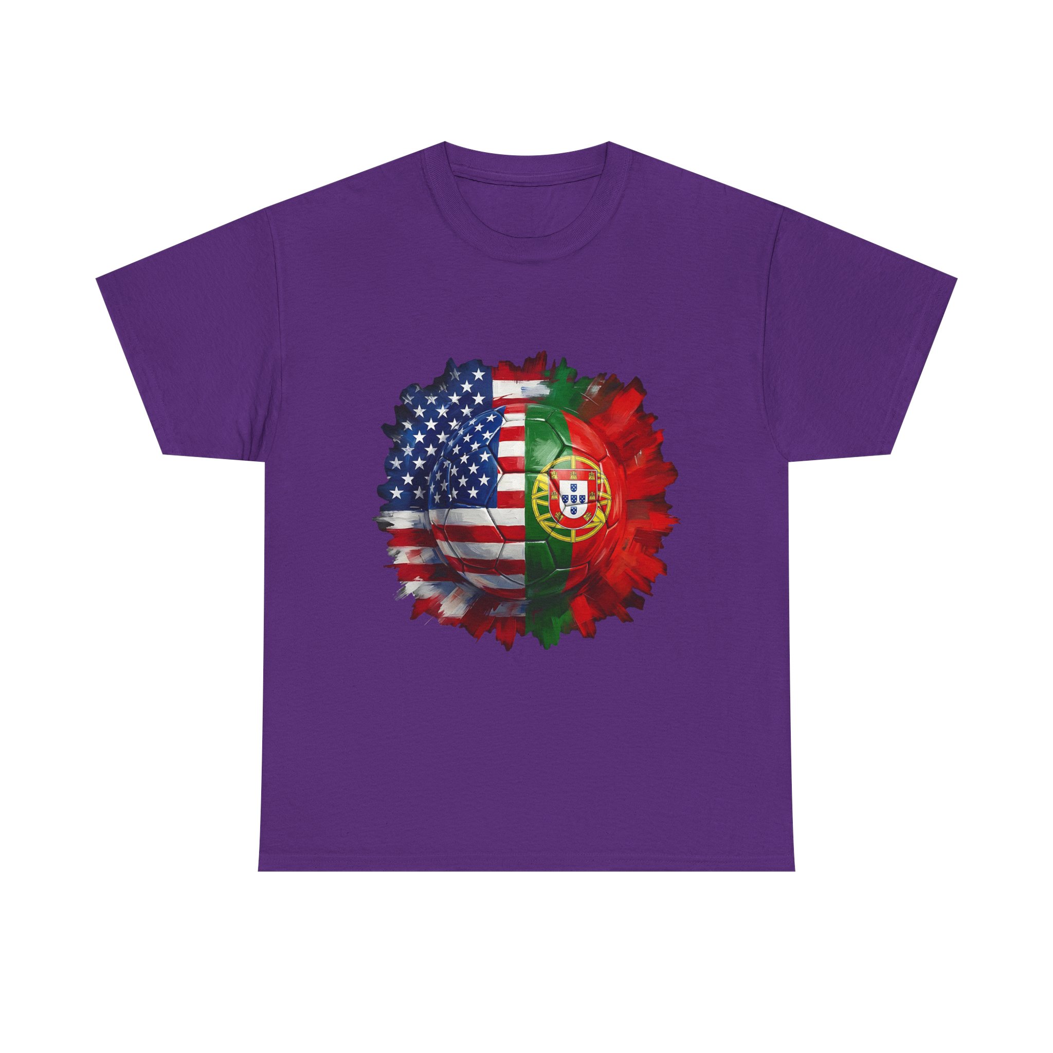 Get match day ready with this bold USA vs Portugal soccer shirt featuring a split football design combining the American and Portuguese flags. Perfect for World Cup watch parties, stadium games, or cheering from home.