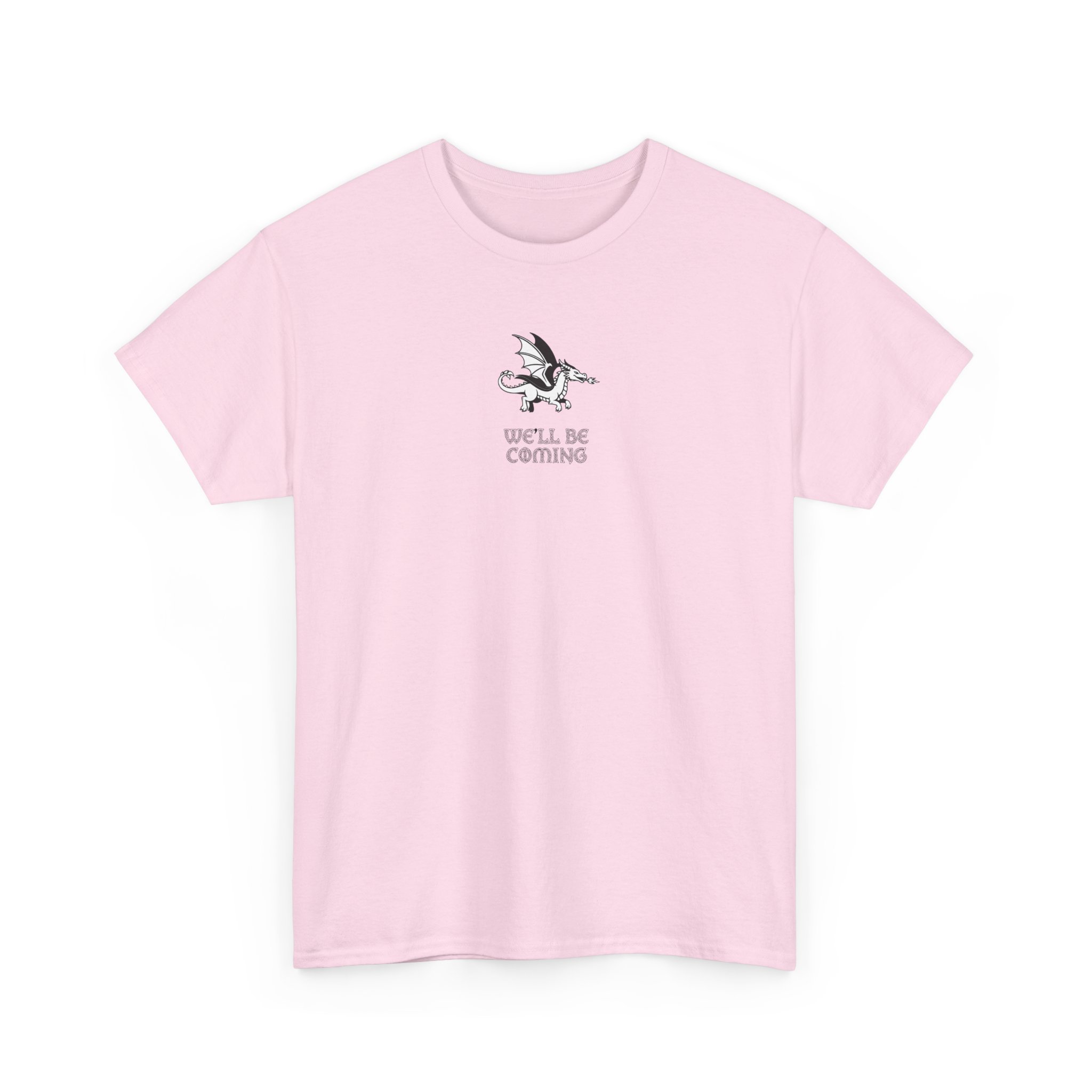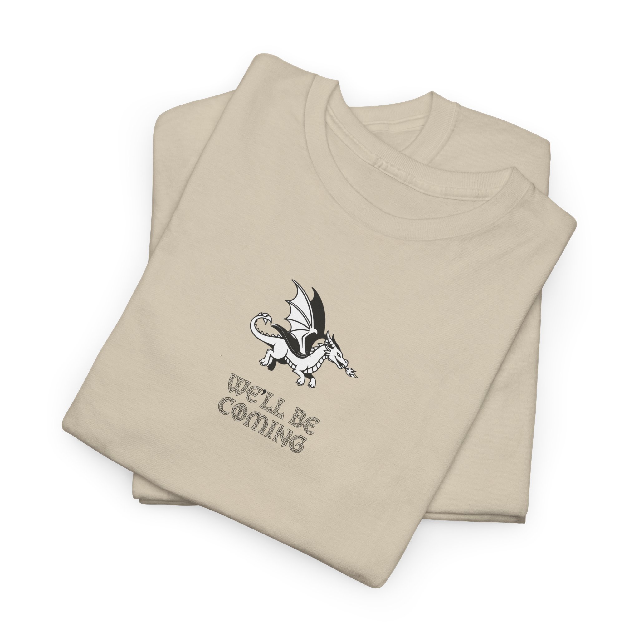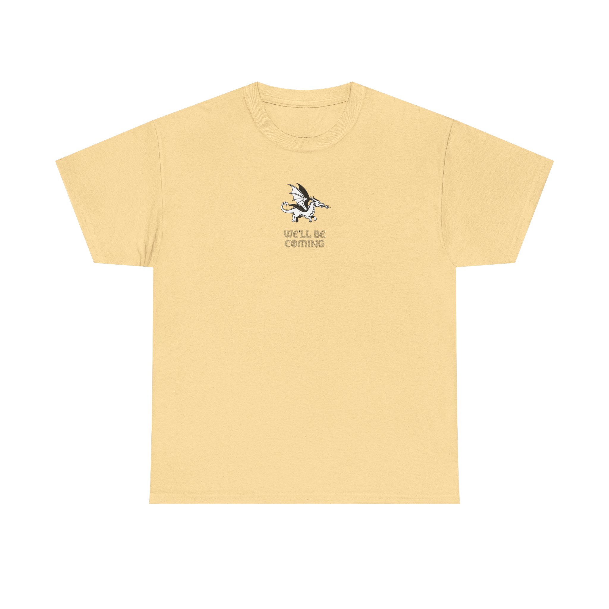 A soft, sturdy cotton tee featuring a tiny flying creature and the phrase “WE’LL BE COMING” in a Scottish-style font.